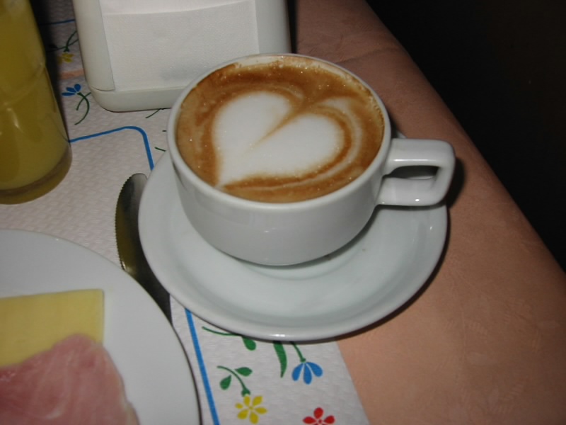 部屋を出るとパンの焼けるいい匂いが立ちこめている。一階フロントのすぐ横にある朝ごはん場所に行くと、そこには数種類のパン、シリアル、ハム、サラミ、チーズなどがきれいに準備されていた。クロワッサンは焼きたてでおいしいし、ハムやチーズもおいしいし、カプチーノにはハートマークを書いてくれるし、なかなかいい感じのところ。たくさん食べて、大満足です。一旦部屋に戻り、荷物をまとめてチェックアウト。クレジットカードの機械が壊れているとかで、現金で払うことになったが・・・(80E)。最終日はまたミラノに戻ってくるので、再度このホテルに泊まれるように予約をする。