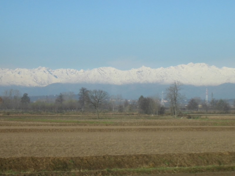 さあ、行きましょう。朝の空気がひんやりと気持ちいい。しかも抜けるような青空。とてもいい気分だ。駅につくともう8時を回っており、20分発のトリノ行きはすでにホームに来ていた。結構たくさんの人が乗っているが、無事に座席をゲット。さあ、トリノに向けて出発だ!トリノまでは2時間弱の旅。車窓からは遠くに雪をたたえるアルプスを眺めることができ、とてもいい景色だ。アルプスのおひざ元、トリノは2006年の冬季オリンピック開催地だ。列車は10時12分の定刻通り、トリノ・ポルタヌオヴァ駅に到着した。