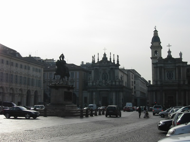 さて、とにかくまずは明日の足の確保。ここからパルマまでは直行便がわずかしかなく、しかも異様に朝が早くなる。それもつらいので、7時45分発の特急で途中のピアツェンツァまで行き、そこでパルマにも止まる普通電車に乗り換えることにした(46.18E)。チケットを確保し、これで一安心。駅前のAstoriaホテルにチェックイン。宿泊者カードへの漢字のサインにおじさんは笑っていた。さて、荷物をおいて行きましょう。今日はユベントス戦を見に行くので、行き方の確認。手持ち現金がいきなり寂しくなったので、250Eキャッシングしてから駅へと向かう。本には9番のトラムで駅前からスタジアムまで行けると書いてあるが、まずトラムが見当たらない。駅前の広場が工事中なので、今はトラムが走ってないのだろうか。駅のインフォメーションで聞いてみる。イタリア語しか話さないので少し苦労したが、どうやら63番のバスにのって終点で降り、そこで72番のバスに乗り換えればいいとのこと。ところがバス乗り場で路線図をみると、どう見ても63と72は連絡していない。たしかに72はスタジアムまで行っているのだが・・・仕方がない。他のインフォメーションでも聞いてみよう。カステロ広場というところにインフォメーションがあり、そのあたりまでは歩いてみようと思っていたのでちょうどいい。ということで、街歩き開始。トリノ、なかなかきれいな街だ。おそらく街の中心の通りを歩いているのだが、途中の広場や道沿いにたくさんのお店がある。ただブランドの服や靴の店が多く、あまり立ち寄って見たい店はないのであるが・・・カステロ広場到着。インフォメーションのおねえさんに、スタジアムへの行き方を聞いて見る。すると、駅前から9番のバスに乗れという。うーん、さっきのおじさんと違うぞ。それに9番ってトラムの番号では・・・と再度確認しても、トラムではなくバスとのこと。そうか、工事中でトラムが走ってないから、代わりに同じ番号でバスが走っているのかな。まあこれでなんとかなるでしょう。