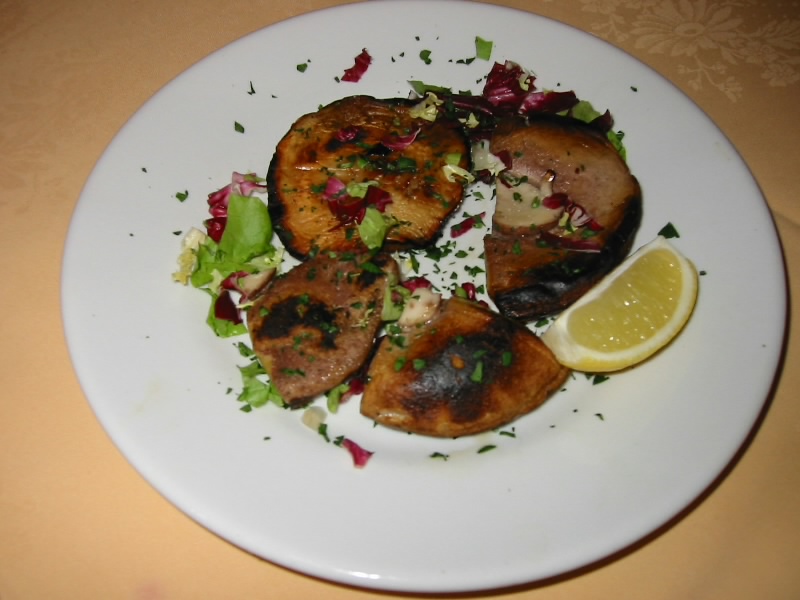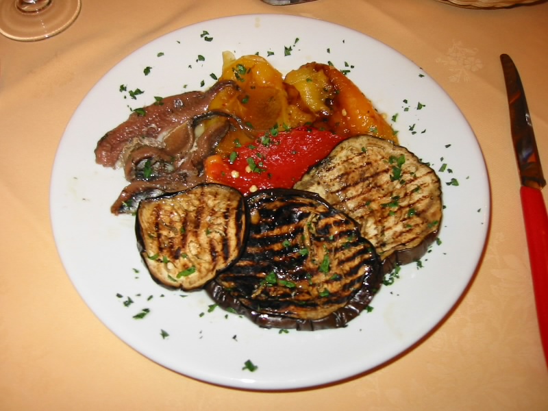 しばらく広場でのんびり過ごす。意外にここまでてこずったせいで、もう12時を回った。なんといっても今日はサッカー観戦の日なので、たっぷりと栄養をとっておかないと。ということでごはん場所を探す。こんなに人が集まる場所なので、どこかいい感じのお店があるだろう。そう思って広場から伸びる道のあたりを探してみる。ところが、いけどもいけどもよさそうなお店が見当たらない。高そうなリストランテとか、カフェとか惣菜やさんとか、テイクアウトのピザやさんは見つかるのだが、なかなかカジュアルな感じのお店が見当たらない。あらら、みんなどこでごはんを食べるのだ?40分以上うろうろしたが、かろうじて2軒ほど入れそうなお店をみつけたものの、今一つ踏み切れない。大通り沿いなのに客がほとんど入ってないのだ。でも仕方ないかな、最後にもう少しだけ通りを行ってみよう、とそこに一見のレストランが。明るい感じのお店で、にぎわっているようだ。よし、ここにしましょう。メニューをもらい、さて何にしましょうか。飲み物は赤ワインのハーフ、前菜、パスタ、メインとフルコースの頼み方をしました。まずは赤ワインで乾杯。軽くて飲みやすいハウスワインだ。そして前菜登場。まずはナスとアンチョビとパプリカの盛り合わせ。味のしっかりとしたナスに濃厚なアンチョビ、そして甘みのあるパプリカ。これはおいしい。食欲が増してくる味だ。もう一品はパルミジャーノとカルチョーフィ。てっきり火の通ったものが出てくると思っていたのでちょっとびっくりしたが、なかなかくせになる味だ。どちらもおいしく、完食しました。つぎはパスタ。まずはオリーブクリームのパスタ。これは・・・失敗。オリーブの風味はいいのだが、とにかく塩辛いのだ。とてもじゃないが食べられないくらいの塩辛さで、ほとんど食べられずに残してしまった。もう一つはかにのペンネ。これはまあまあおいしいが、蟹がかにかまのようなのと量の多さでこれも半分くらいしか食べられなかった。うーん、最近日本でもおいしいパスタを食べられるので、ちょっとこれはいただけないな。気を取り直して、メイン。まずはポルチーニ茸のグリル。香りのいいしっかりとした食感のものもあれば、とろとろの食感のものもある。乾燥ものは食べたことがあったが、生は初めてで、これはなかなかおいしかった。そして子牛のサルティンボッカ。去年ローマで食べたものとかなりイメージが違ったが、淡泊な子牛肉とパルミジャーノの組み合わせがおいしい。結局、パスタはほとんど食べていないにもかかわらず、満腹になってしまった。いいお店だとは思うのだが、パスタの選択ミスか・・・残念。勘定をすませ(42E)、お店を出た。