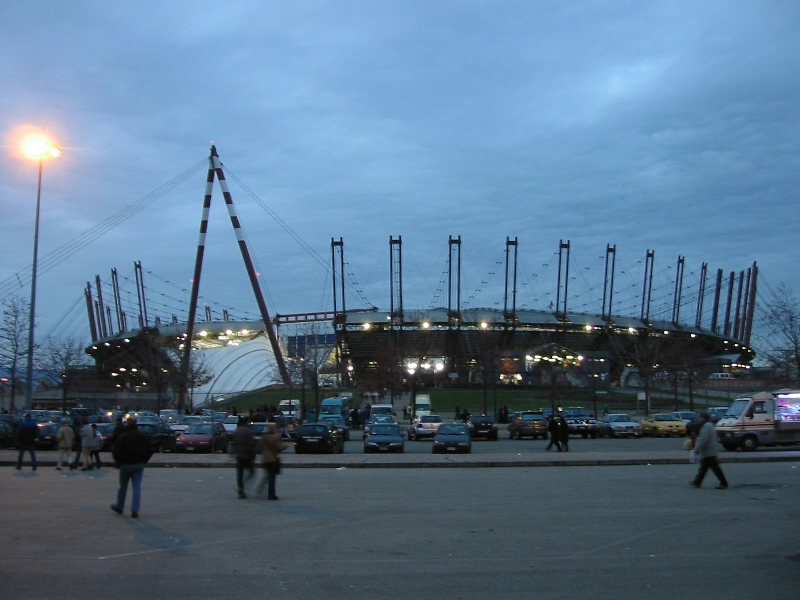 ということでホテルに戻って寒さ対策をし、駅で水を買い(1.4E)、バスのチケット買い(@0.9E)、準備万端。バス停で9番を待つ。バス停にはおおよその到着時間が出ているので分かりやすい。しかしなんやかやで、もう4時前。最初は4時までにはスタジアムに到着しようと思っていたのに・・・まあいい。しばらくしてバスが来た。念のためにスタジアムまで行くのかどうかを聞いてみると、なんと「行かない」との返事。???どういうことだ。とはいえ運転手さんが行かないというバスに乗るわけにも行かず、結局そのバスには乗れず。???次の9番にも聞いてみるしかないが、さっきバスのチケットを買ったところでスタジアムへの行き方を聞いてもらうと、やはり9番でいいとのこと。うーん、よくはわからないがとにかく次の9番を待つ。結局20分くらいたって、ようやく9番到着。改めて運転手さんに聞いてみると、確かにスタジアムに行くという。じゃあさっきの9番は何なのだろう?とにかく乗り込み、出発だ。でもどうやら他にもスタジアムに行く人がいるようで、運転手さんに確認している。じゃあ大丈夫だろう。バスの中で、日本人の女の子に声をかけられた。どうやら彼女もユベントス戦を見に行くようだ。バスは出発し、快調に走っている。途中から乗る人の半分くらいは、スタジアムへ行くかどうかを確認しているようだ。ユベントスのマフラーらしきものをしている人もいるので、安心だろう。そんな人たちでバスの中は結構混雑してきた。ところが20分ほどたったところ、BOLOGRAD通りからTOSCANA通りに曲がったところのバス停で、急にその人たちが降りてしまった。なんだなんだ?あわてて運転手に確認すると、ここで降りろとのこと。なんだかよくわからないがとにかく降り、さっきの人たちについて行く。するとすぐ近くにバス停があり、そこには72番の文字が。最初のインフォメーションのおじさんが教えてくれた番号だ。ということは最初のおじさんもその後のおねえさんも、一部当たりの一部外れ。うーん、わかりづらい。でもまあとにかくここで待っていればいいのだろう。と、そういえばさっきの女の子がいない。そのまま乗っていってしまったのだろうか。混んできたせいで離れてしまったし、こっちも勝手がわからないのでとっさに降りてしまったのが・・・まあ、路線図を見る限りさっきのバスもスタジアムの近くまでは行くようなので、なんとかなるでしょう。幸運をお祈りします。10分位待っただろうか、72番のバスが到着した。かなり混んでいるが、何とか乗り込む。荷物には注意しないとね。バスは住宅街を抜け、大通りに入る。すると、一瞬スタジアムの姿が見えた。そしてバス停に到着し、降りてみると・・・目の前にはユベントスのホーム、スタジオ・デッレ・アルピがそびえていた。