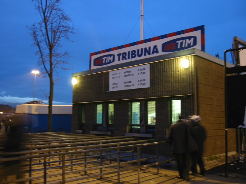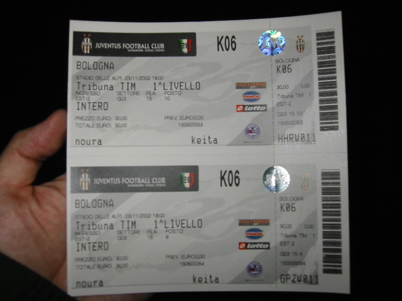 6万人が収容できるので、かなり大きい。晴れた日にはアルプスが見渡せるらしいが、もう夕方で暗いし少し曇ってきたので、残念ながら見えない。でもスタジアムの回りにはたくさんのショップが出ており、ずいぶんと盛り上がっている。一番近い入り口はサポーター用のゴール裏のようだが、われわれは初心者なのでバックスタンド。さて、どこでチケットの引き換えができるのだろうか。ユベントス戦のチケットは、LisTicketというサイト(http://www.listicket.it)で予約ができる。まず会員登録が必要だが、試合と座席の種類を選ぶと席の配列図がでるので、そこで希望の席を選び、クレジットカードの情報をいれると予約番号が発行される。その番号をスタジアムのチケット売り場で提示すれば、それでチケットがゲットできるのだ。何という便利な世の中なのだ。10月にはチャンピオンズリーグのユベントス−フェイエノールトも出ていたし・・・ただこの予約サイトでは、ユベントスの他はローマ、ラツィオ、トリノしか取り扱っていない。いろいろ探した結果、インテル、エンポリ、コモそして俊輔のレッジーナはTicketOne(http://www.ticketone.it)、ミラン、ボローニャはBestTicket(http://www.bestticket.it)で取り扱っていることがわかった。残念ながら、今日ミラノで行われるミラノダービーは(ミラン−インテル)はサイトを見つけた時点ですでにSOLD OUT。また行くことがあったら、もっと事前にいろんな試合の確保ができるかもしれない。それにしても、日本のぴあみたいに一つのサイトですべてを取り扱えばいいのに・・・少しわかりづらかったが、東1番入り口に到着。ここで予約番号と引き換えに、チケットをゲット。初のセリエA、ユベントス−ボローニャのチケットはこうしてゲットした。さあ、さっそく中に入りましょう。係員の指示に従い一階席に向かう。そしてスロープを降りると、そこには緑のピッチが広がっていた。