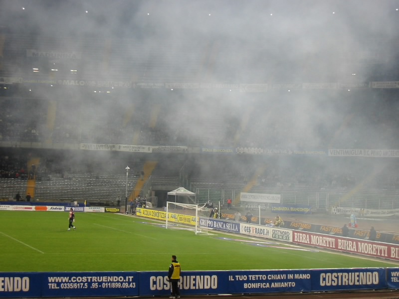 これがセリエAのピッチだ。席はもうかなり埋まっている。ゴール裏のユベントスサポーターは、すでに気勢を挙げて盛り上がっている。かなりの声だ。Jリーグと違うのは、ゴール裏がいずれもユベントスサポーターが集まっているところ。ボローニャサポーターはバックスタンド2階の一番端、ゴール斜めのごく限られたスペースに追いやられている。ここはここで盛り上がっているようだが。しばらくすると選手が入場し、練習が始まった。距離はあるが、ゴール前にはブフォンがいるのが分かる。ネドベドは金髪なので分かりやすい。デルピエロは練習にいないのか、見当たらないようだ。目の前にあのユベントスの選手たちがいるのだ。スタジアムもすでに盛り上がっているし、これは楽しい、病み付きになりそうだ。スタジアム内のオフィシャルショップでシャルパを買い込み、準備完了。さあて、どんな試合になるのだろうか。そしてしばらくして、スターティングメンバーの発表が行われた。GKは当然ブフォン。ネドベドのところでスタジアムはかなり盛り上がる。人気者なんだな。デルピエロは先発を外れたが、後半きっと出てくるだろう。トレゼゲやテュラム、ダービッツを欠いているのが残念だが・・・メンバーの発表と合わせるかのように、サポーター席から発煙筒の煙があがる。ボローニャ側からは爆竹も投げ込まれる。Jリーグでは考えられない光景だが、こちらではこれが普通なんだろう。さあ、キックオフだ。発煙筒の煙がスタジアム全体に広がっている状態でゲームはスタートした。