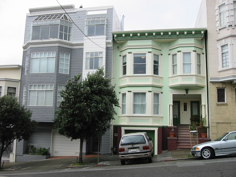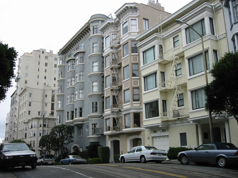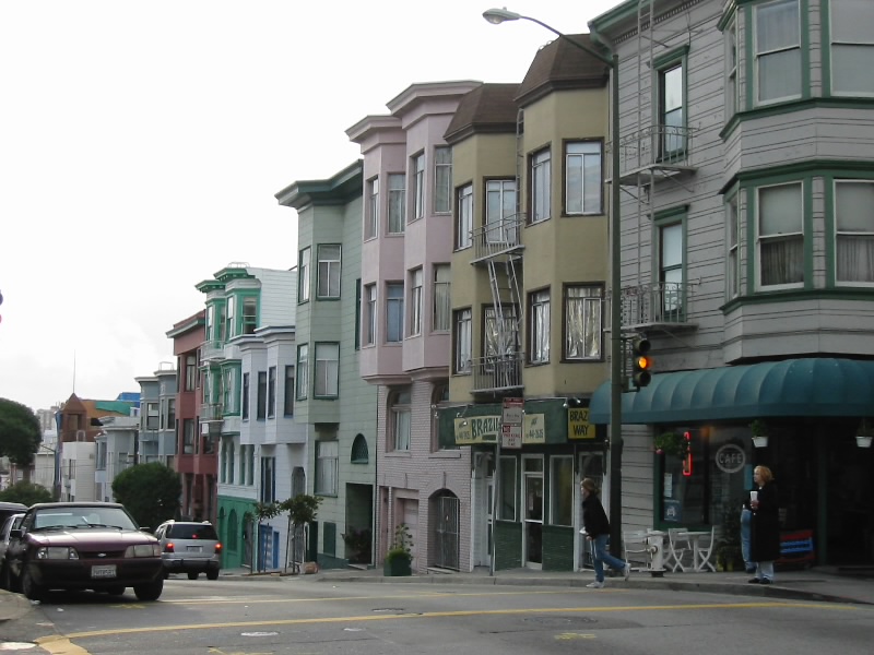 お店を後にしチャイナタウンを少し歩く。雨もほとんど降っていない。途中、ミーミーベーカリーというお店でフォーチュンクッキーをゲット(1.1$)。何でもクッキーの中に占いを書いた紙が入っているらしい。みんなに配るとするか。さて、どうしようか。スーパーに行きたい、と言うことで調べて見ると昨日晩ごはんを食べたお店からそう遠くないところにスーパーがあるようだ。ちょうどケーブルカーが来たので飛び乗ったが、パウエルメイソン線だったので行き先が違う。よって途中で降り、停留所でパウエルハイド線を待つ。ところがその後来るのはパウエルメイソン線ばかり。30分以上たってもまだ来ない。ふつう10分おきには来るものだと思うが、何かあったのだろうか。結局その後もしばらく待ったが来ないので、歩いて行くことにした。距離としては1キロ程度だが激しい登り下りが待っているのでアキレス腱を延ばしておかないと。坂を登り始める。途中何度か振り返るが、まだケーブルカーが来る気配は無い。この辺りは住宅街のようで、たくさんの家が建っており、それがなかなかかわいいのだ。薄いグレーやブルーやピンクを基調にした外観が多いのだが、なかなか上品でいい感じ。