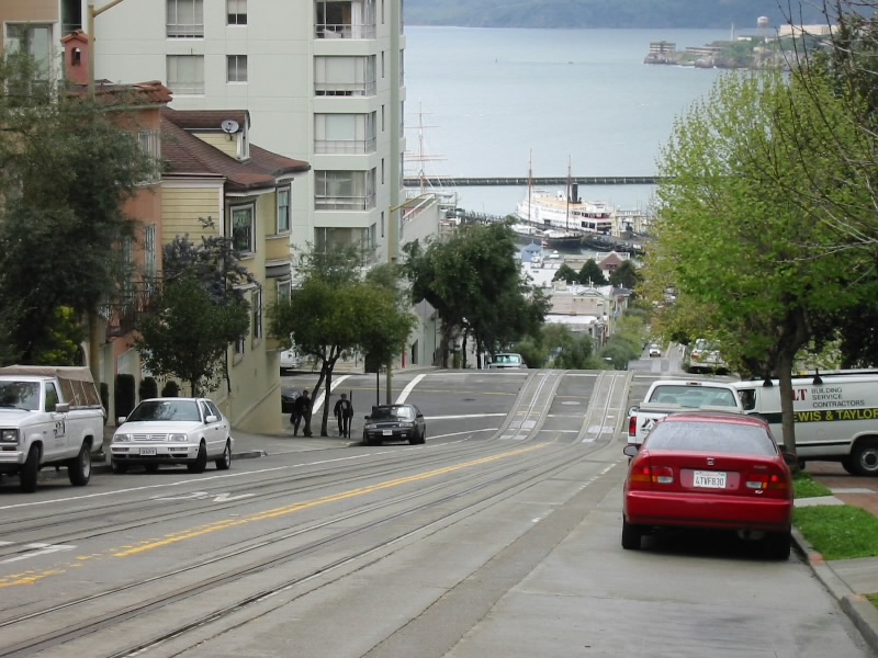 坂道を登りきり、今度は下り。こちらは早いが、ひざには来るぞ。そうこうするうちに、昨日晩ごはんを食べたお店までやってきた。もうしばらくケーブルカー沿いに歩き、途中のブロードウェイ通りを左折するのだが、結局ケーブルカーは来なかった。どうしたんだろう。そこから5分ほど、POLK通り沿いにスーパーを発見。早速中に入る。新鮮な野菜などの食料品がたくさんある。やっぱり外国のスーパーは楽しいぞ。と、外を見るといつの間にか大雨。グッドタイミングだ。あのままケーブルカーを待っていたらどうなっていたか・・・ということで、スーパーをゆっくりと見ることにする。アメリカなので肉は安いようだが、パスタやトマトソースなどの食材はむしろ日本の方が安いくらいで、それほど買うものは無いようだ。それでもタコスの素やクラッカー、水などを買う。ちょうど雨も上がったようだ。帰りますか。ケーブルカーを目指して歩く。この通りにもかわいい家が並んでいる。いい街だ。そろそろハイド通り、と思ったころに1台のケーブルカーが目の前を通って行った。無事復活したのかな。さて、次はハイド通りのお店チェック。よさそうなイタリア料理屋さんとスペイン料理屋さんがあるのだ。メニューを見比べると、どうもスペイン料理屋さんが良さそうだ。よし、今晩はここにしましょう。ケーブルカーを待つ。が、また来ない。15分であきらめ、また歩くことに。まずは上り坂が続き、そして下り坂。海が見えてきたぞ。その途中にロンバート通りがある。歩け歩け!それにしても急な坂だ。途中、遠くにゴールデンゲートブリッジが見えた。行きたかったが、今日のような天気ではちょっと難しいかも。あきらめましょう。ようやく下まで降りてきたぞ。一旦ホテルに戻り、ちょっと休憩。お疲れ様でした。