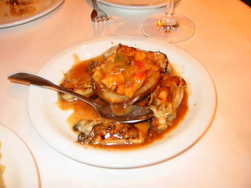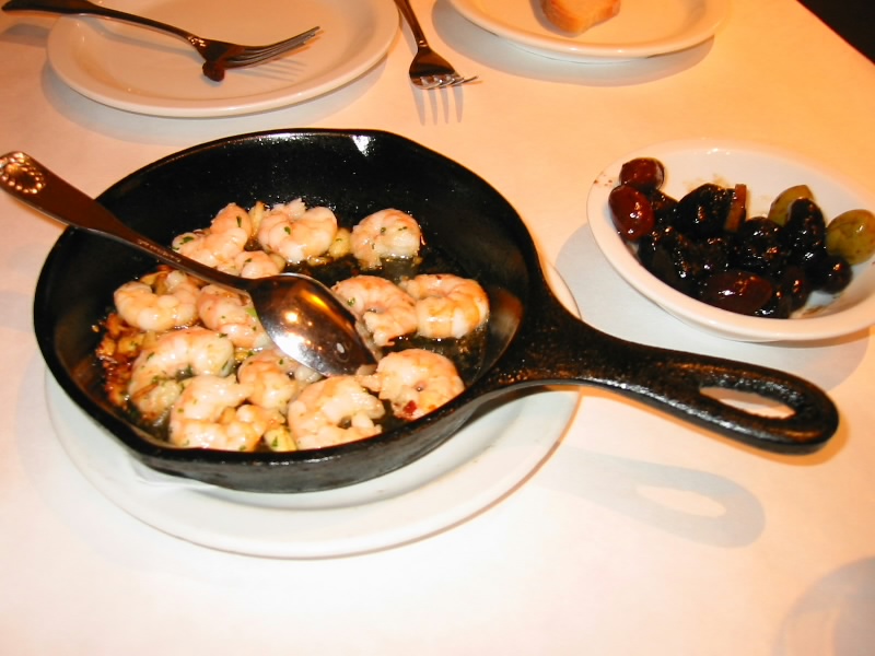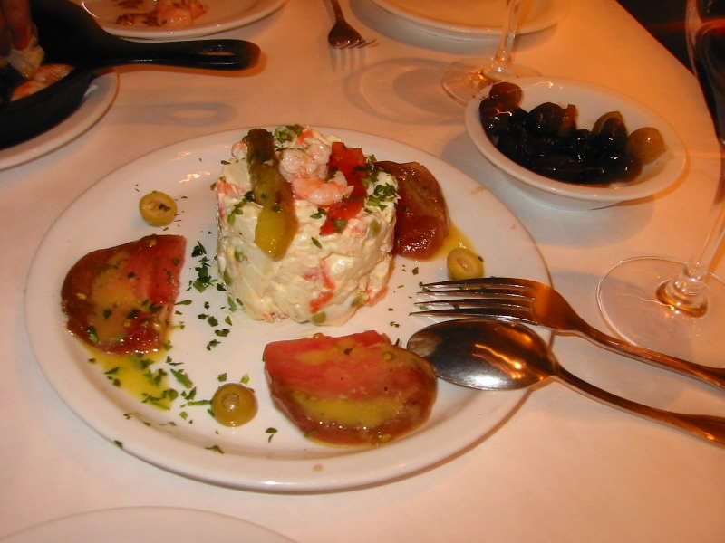 ワインが重いので再度ホテルに戻り、晩ごはんに出発だ。ケーブルカー乗り場に向かうと、そこにはものすごい行列が。それなのにそれほどいっぱいにせずに走りだそうとしている。これでは1時間待ちでも済まないかもしれない。ん、ということは途中から乗ればいいわけだ。速攻で坂を上り次の停留所へ。この間100メートルほどだろうか。と、すぐにケーブルカーが来た。それほどいっぱいでは無いので簡単に乗ることができた。頭いい〜。あっと言う間にスペイン料理屋さん前に到着。6時くらいにもかかわらず、もう既ににぎわっている。人気のお店なのかな。テーブルに案内され、さて何を頼みましょうか。ワインはカリフォルニアの赤、そしてエビのガーリック炒めとタコのスペイン風、そしてポテトサラダを注文。まずはワイン。久々の赤ワインだ。まろやかでおいしい。付け合わせのオリーブがまたおいしい。これは楽しくなりそうだ。しばらくすると、エビのガーリック炒め登場。ガーリックの香ばしい香りがたまらない。さてさて・・・これはうまい。エビがとても新鮮で、プリプリしている。さらにこの皿のオイルをパンにつけるとまたうまいのだ。続いてポテトサラダ。創作料理風の盛り付けなので、一瞬どうかと思ったが、これもおいしい。付け合わせのトマトのマリネもまたおいしい。ご機嫌だ。そしてタコのスペイン風。タコがとても柔らかく、ジャガイモと一緒に食べるとほくほく感とともにとろけそうだ。うまいね。ワインとの相性もばっちり。さて、無くなってしまったぞ。追加でスパニッシュオムレツとカキのスペイン風を注文。スパニッシュオムレツはパプリカのソースとともに食べるのだが、これもおいしい。カキのスペイン風は思わずガッツポーズ。見るからにうまそうだ。カキを食べて見ると、口の中でとろけるようだ。うまい、うますぎる。過去のアメリカは期待を裏切り続けていただけに、ここサンフランシスコでの食の充実ぶりはなんなのだ。全くうれしい限りだ。ワインもおいしいし。ふー、おなかがいっぱいだぞ。でも今日はデザートもいただきましょう。プリンと紅茶で締めましょうか。素朴なプリンがとてもおいしいぞ。デザートをゆっくりと楽しみながら、ふと周りを見るともう満席。それどころか外で待っている人もいる。日本のガイドブックには載っていないが、本当に人気のお店なんだな。これはいいお店を見つけたものだ。しめて70$、大満足です。