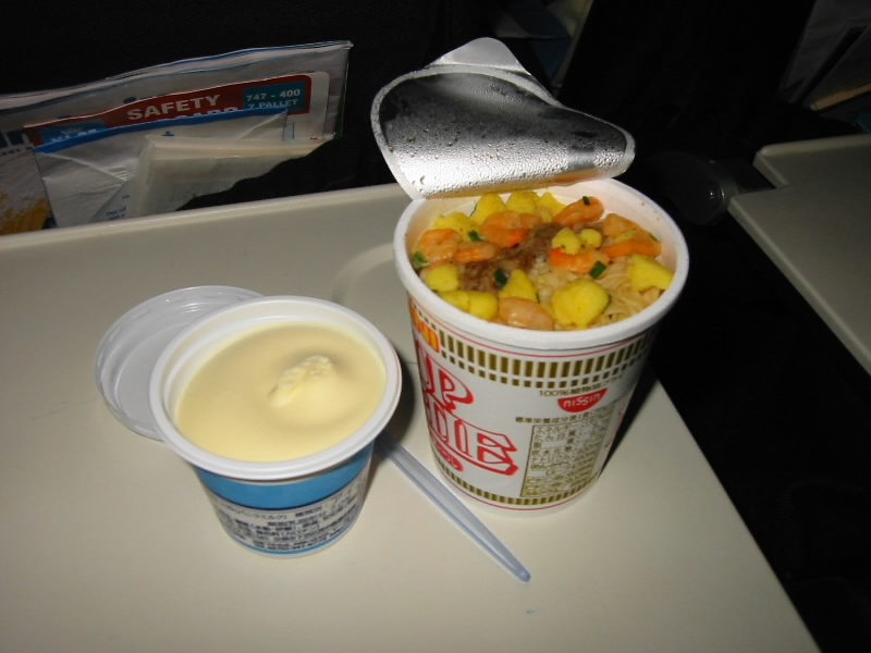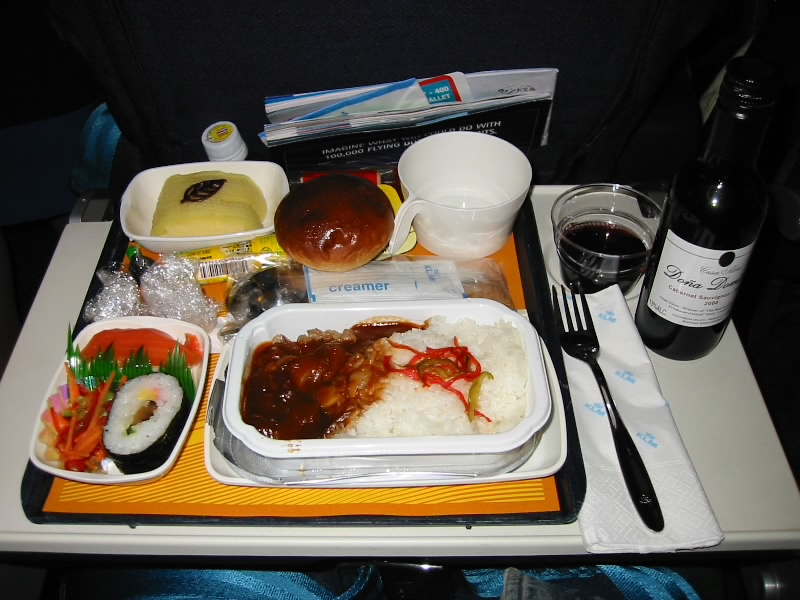 さて、そろそろ出発だ。満員のKL868は定刻の10:25、アムステルダムに向けて出発した。さて、まずはいつものドリンクサービス、もちろんビール。ここまではご機嫌だ。さて、問題は機内食。最近のKLMの凋落振りは目を覆うものがある。前回は2000年末、英仏珍道中において「カツ丼とパンとパンケーキ」というわけの分からない組み合わせを食べさせられたのだ。さて今回はどうだろうか・・・「和食と洋食どちらになさいますか?」スチュワーデスの声。そうだなあ、朝は和食だったから洋食かな。と思い洋食を頼むと・・・なんとハヤシライス。ま、確かに洋食だが、ちょっとこれは期待はずれというか予想通りというか。しかも寿司つき。米だらけではないか。ママの選んだ和食のほうはまだましなようだが。うーん。メインがハヤシライスだとあっという間に食べてしまい、お酒が進まないのだ。KLM、なんとかしてくれ・・・食後は音楽を聴いたりしながらのんびり過す。相変わらず妙なセンスではあるが、年末のときよりも新しい曲や知っている曲が多い気がする。ちょっとはましかな。しばらくして、おやつタイム。カップヌードルとアイスクリーム、どちらか好きなほうを選ぶ。せっかくなのでひとつずつにしましょう。これはもちろん想像通りの味で、おいしいぞ。さっきの機内食よりよっぽどましかも・・・