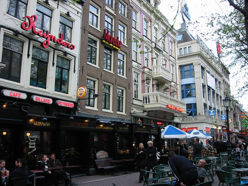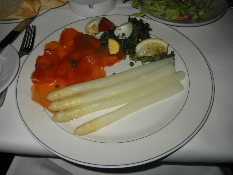 さあて、時差ぼけではあるが晩ごはんは何にしようか。早い目に食べて今日はゆっくり寝ないとね。ライツェ広場の周りにはたくさんのお店がある。ぶらぶらと見て回ると、あるお店の中でホワイトアスパラを食べている人たちを見た。この時期オランダではちょうどホワイトアスパラが旬で、みな待ちかねたように食べるらしい。これは是非食べてみたいものだ。他のお店も見てみたが、ホワイトアスパラはなさそうだ。イタリアンや中華のお店もあったが、それもちょっと気分ではない。と、いうことでさっきホワイトアスパラを見たお店に入る。結構賑わっていたが、ちょうど4人がけのテーブルに案内された。さて、何にしましょうか。