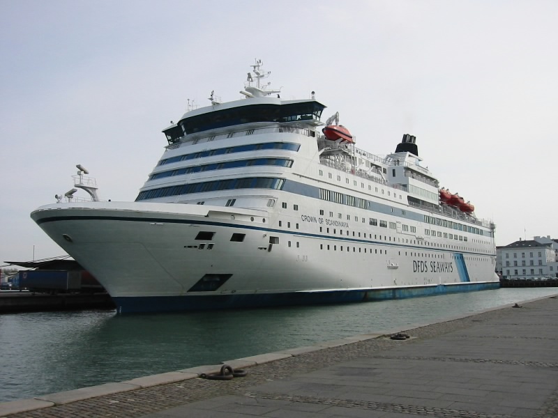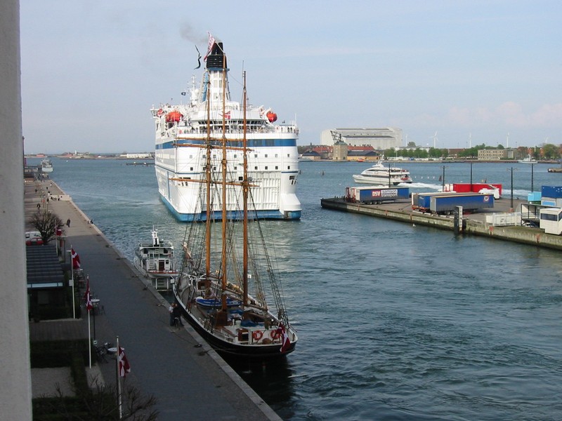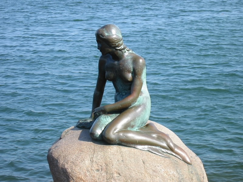 >少し疲れたか、みんな居眠りモード。電車は快調に走る。だんだん都会になってきたぞ。2つ手前の駅、Osterportで降りる。ここから人魚の像まで歩いて行こう。しばらく歩くと公園のようなところに出る。堀があり、五稜郭のような形になっている。緑が気持ちいいぞ。緩やかな坂を上ると海が見えてきた。そろそろかな。海に向かって坂を降りると、人が集まっているところがある。近づいてみると、ありました。世界一有名な人魚の像だ。思ったよりはかなり小さい。でも観光客が入れ代わり立ち代わり写真をとっている。像と同じ格好をして写真を撮っている女の子がほほえましい。しばらくその場で過ごし、そろそろ行きましょうか。ここからは海沿いの道をずっと行けばホテルに帰ることができる。でも海沿いは少し寒いので、一本はいった道を歩く。しばらく行くと、アメリエンボー宮殿に到着。ロータリーに面した静かな建物だ。ここには女王様が滞在することもあるそうだ。宮殿の前には衛兵がいて、独特の歩き方で巡回している。夏の昼間には、衛兵交代の儀式も行われるようだ。さて、ここらで海沿いに出てみよう。小さな公園を抜けると、ホテルに続く道に出る。今朝着いた船が、まだいるようだ。近くでみると、本当に大きな船だ。明日これに乗ると思うと、とても楽しみだ。