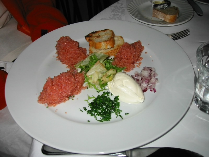 ようやくホテルに戻ってきたぞ。けっこう歩いたので、ちょっと疲れた。部屋に戻って少し休憩することにしよう。のんびりしていると、汽笛が聞こえた。あの客船が、いよいよオスロに向けて出発したのだ。ゆっくりと、でもしっかりと進んでいく。部屋から見えなくなるまでずっと見ていた。今日はいい天気なので、絶好の船旅日和だ。明日もこんな天気だといいな・・・その後しばらく休憩、少しうとうとして疲れをいやす。さて、19時を過ぎた。晩ごはんに行きましょうか。さすが北欧、外はかなり寒いぞ。ホテルから少し歩いたところに、ニューハウンというエリアがある。かつては船乗りたちが羽根を伸ばした場所らしいが、今はレストランやアンティークショップの並ぶ人気エリアとなっている。さてさて、どうしましょうか・・・しかし寒いな。あまりのんびり探す気分ではないが、ざっと一通りお店をみて、よさそうなお店に入る。しかしこんなに寒いのに外のテーブルでビールを飲んでいる人がいる。どういうことだ?お店の中は暖かい。テーブル席に案内され、メニューをもらう。どうしようか。よくわからないが、サーモンや白身魚らしきものを頼む。まずは白ワインで乾杯。今日も一日、お疲れさまでした。今日ぐらいみんなで散歩できれば、十分に楽しめる。やっぱり健康で元気が一番だよね・・・料理が運ばれてきた。全部魚がメインの料理だが、ママに運ばれた一品だけは前菜のようで、魚卵がメイン。うーん、これでは物足りないか?まあせっかく4種類の料理が目の前にあるわけなので、それぞれ少しずつとりわけながら食べる。どれも新鮮なのだろう、とてもおいしい。