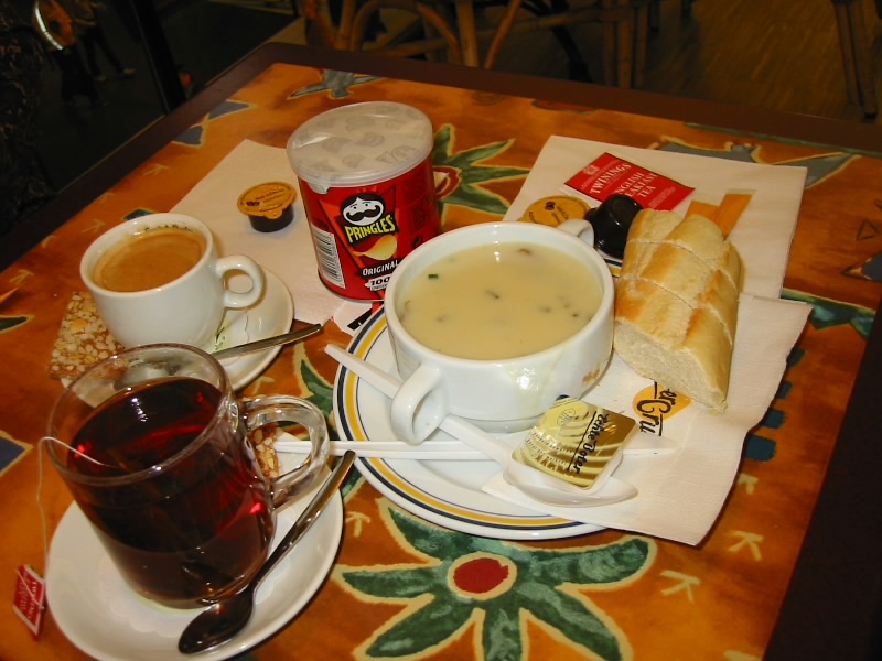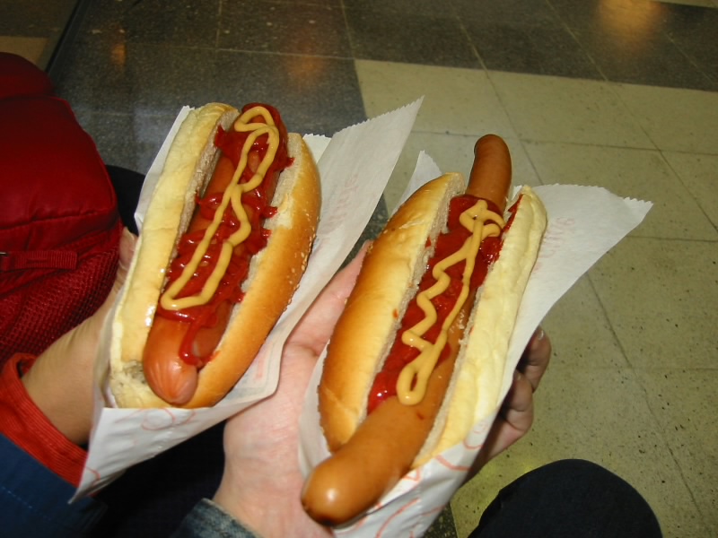ふう、暖かい。人気のない空港でしばらく時間を過ごす。しばらくすると売店があき、空港の係員が現れ、だんだんにぎやかになってきた。とりあえずチェックインをすませ、朝ごはん。売店にホットドックがあったので、小銭整理の目的もありこれにしましょう。そんなに期待していたわけではないが、これがなかなかしっかりとしたホットドッグで、ソーセージがおいしいのだ。予想以上の味にご機嫌だ。ようやく外が明るくなってきたようだ。出発ゲートに向かい、飛行機に乗り込む。一路、アムステルダムに向けて出発だ。