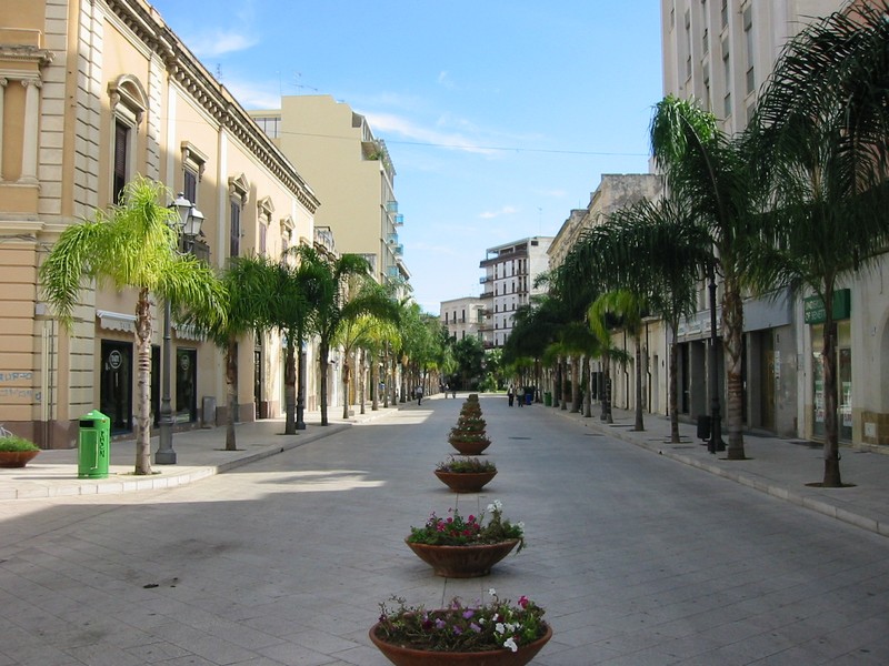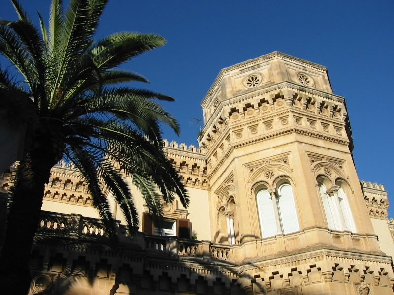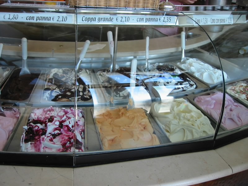 外へ出ると・・・涼しい。もっともっと暑いと思っていたのだが、思いの外涼しいのだ。南イタリアということなので、今回まったく上着を持ってきていない。カイロリ広場へ行くと、AVISの看板が見えた。今日は閉まっているが、明日はここで車を借りるのだな。今日は電車でレッチェ観光の日だ。駅へ行き、時刻表を見ると・・・うーん、あんまり無いなあ。1時間後にミラノからのユーロスターが来るはずなのだが、すでに2時間半遅れの表示が。その後は普通電車があるが、2時間近く後だ。まあいいか。ユーロスターは当てにならないので、12時3分発の普通電車にのることにしよう。チケットを買い(@2.32E)、出発まではブリンディジの港まで散歩しよう。駅から港までは20分ほど。途中歩行者天国になっているところもあり、歩きやすい。まだ人出もすくなく、空気が心地好く、青空がすがすがしい。散歩がとても気持ちいいぞ。港に近づくにつれ、フェリーのチケットを売る店が増えてくる。ここブリンディジは、ユーレイルパスでギリシャに行くための港。ほかにはトルコ行きや、アルバニア行きの船がでているようだ。そんな船旅もしてみたいものだ。さて、港に到着。光を浴びた海が広がり、とても気持ちがいい。今日の夜はこのあたりで晩ご飯を食べたいので、下見がてらざっと海沿いを歩く。釣りをしている人がたくさんいるぞ。のどかな雰囲気だ。さて、ちょっと休憩しよう。大阪本町にあるなじみのイタリア料理店・Piccolo Mondoの店長、ジャンおすすめのジェラートやさん、BarBettyに入り、メローネ(メロン)とペスカ(桃)を頼む。甘いがその甘さがすっと引き、果物の風味も嫌味が無く、とてもおいしいぞ。満足です。