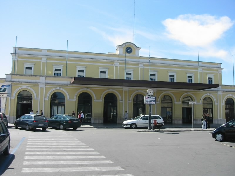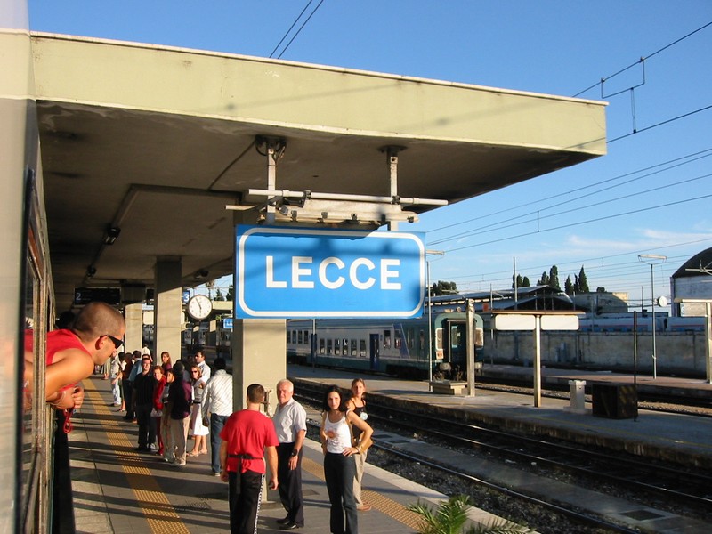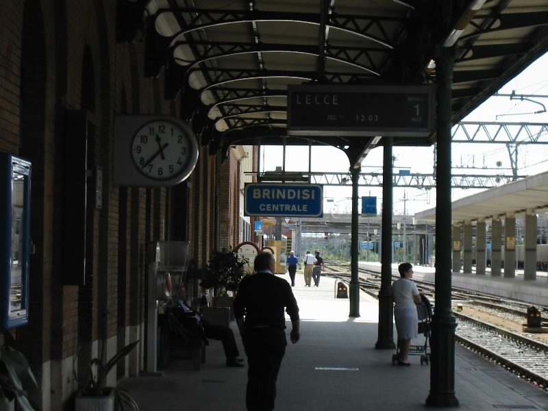 さて、ぼちぼち駅に戻りましょうか。日向を歩くと暑いが、日陰は涼しい。街行く人は、Tシャツからコートまでいろいろだ。駅に着き、しばらく電車を待つ。向かいのホームにはトリノ行きのユーロスターが来るらしいが、遅れているようだ。レッチェからだと最初の停車駅がブリンディジのはずなので、いきなり遅れているということだ。イタリアの電車はなんでこうも遅れるのだろう・・・・我々ののる普通電車はほぼ時刻通りに来たのだが、どうもこの先が単線のようで向かいのユーロスターの到着待ち。結局10分ほど遅れて、レッチェに向けて出発した。途中の駅でも向かいの電車を待つのでかなり遅れ、レッチェに着いた頃にはもう13時。20分は遅れたかな。まあイタリアではよくあること、いい方かも。まずは昼ご飯だな。