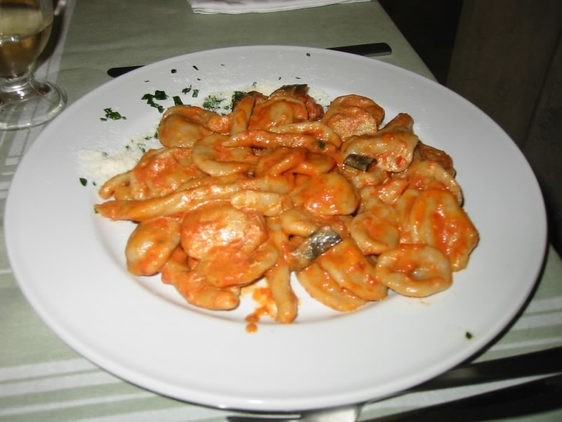 レッチェの駅からしばらく行くとドゥオモ広場があり、そこから伸びる道がちょっとしたメインストリートになっている。道沿いのレストランを見ながら歩くが、今一つぴんと来るのが無い。しばらく歩くとサントロンツォ広場に出た。うーん、カフェはたくさんあるがトラットリアが無いなあ。もうしばらく行ってみると、よさそうなお店を発見。賑わっているようだし、ここにしましょうか。中に入るとセルフサービスとリストランテが併設されていた。ゆっくりとおいしいパスタを食べたい気分なので、リストランテにしましょう。のどが乾いたこともあり、まずはビールとハウスワインの白でのどを潤す。最初にいろんな種類のパンが出てきたのだが、これがなかなかおいしい。トマト風味のものやオリーブ入りのものがあり、ビールにもよくあう。しばらくして、パスタ登場。一つは魚貝のリングイネ。海の風味がたっぷりで、とてもおいしいぞ。もう一つはトマトソースのオレキエッテ。オレキエッテとはプーリア地方特産のパスタなのだが、もちもちした歯応えでおいしい。このくらいならあっという間に食べてしまうが、夜にしっかり食べるためにはこのくらいで。ごちそうさまでした(17.50E)。
