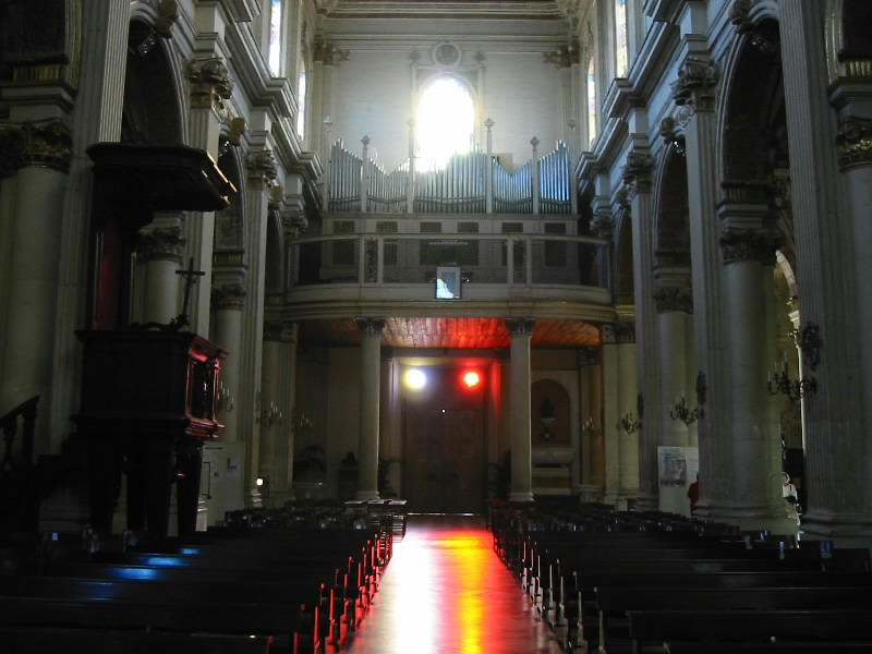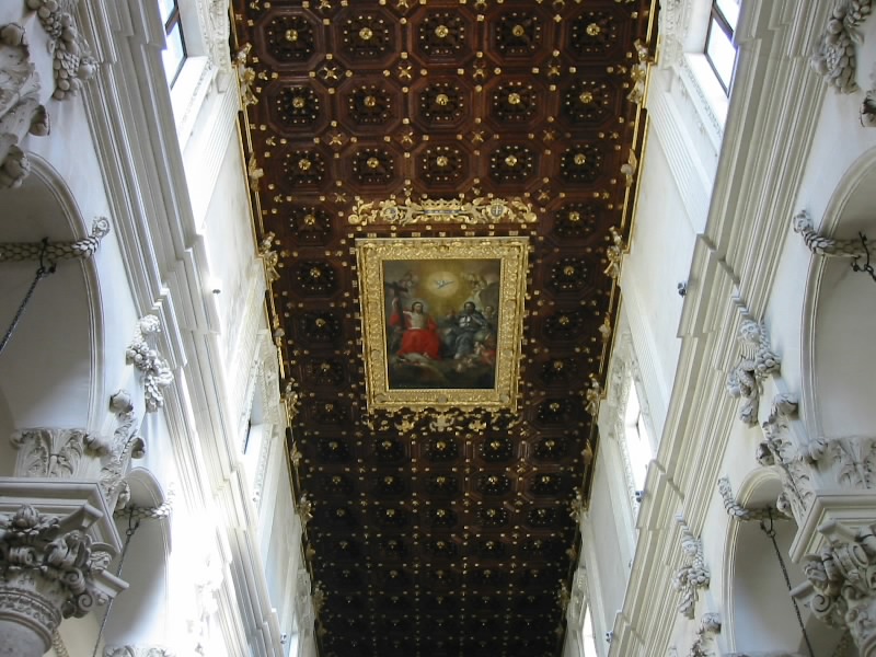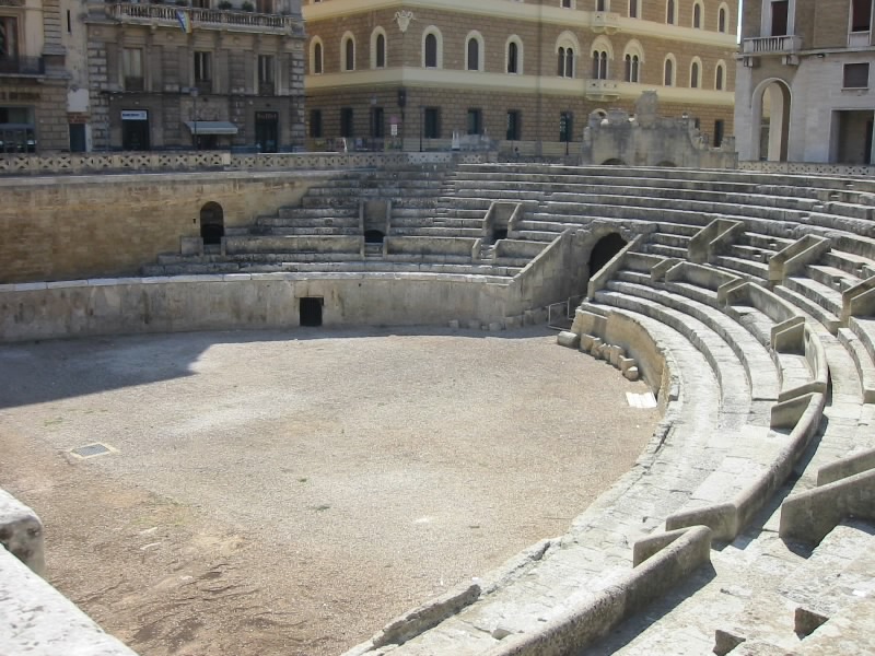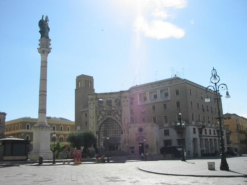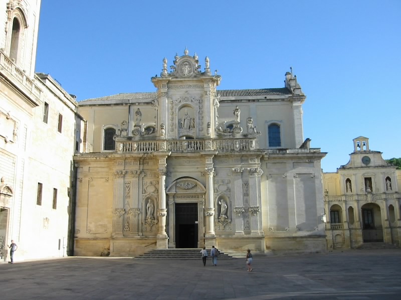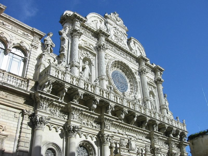 さて、食後はレッチェの街を散歩。見所としてはバロック様式のサンタクローチェ教会となるが、開くのが16時半なので、それまではのんびりと過ごしましょう。まずはサントロンツォ広場。広場には「ローマの円柱」があり、そのてっぺんにはこの街の守護聖人・聖オロンツォの像がある。他には「円形競技場」「サンタ・マリア・デッラ・グラッツィア教会」など。昼間なので日差しはきついが日陰に入ると涼しいし、人もそれほど多いわけでは無いし、静かだし、のんびり過ごすにはなかなかいい感じだ。しばらくして、近くの公園へ行ってみる。緑の多い公園で、子供達が走り回っている。日陰のベンチでしばし休憩。さあて、そろそろ16時半、教会へ行きましょう。サンタクローチェ教会は1549年から1679年にかけてつくられたもので、豪華絢爛なバロック装飾。外も凄いが、中もかなり豪華だ。天井には金ぴかの額に入った絵が飾られている。