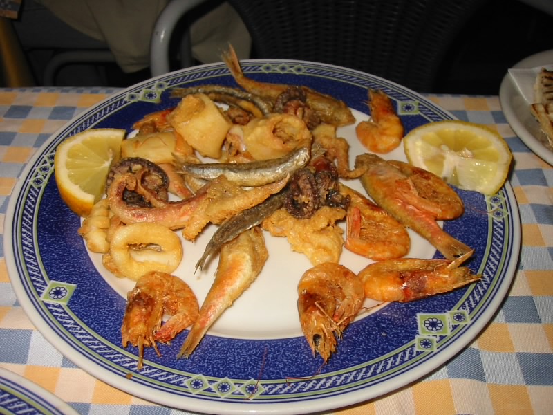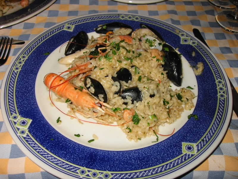 そろそろ8時だ。出かけましょうか。その前にマオに電話だ。マオとはPiccolo Mondoのジャンの弟で、たまたま同じタイミングでブリンディジ近くにある実家に里帰りしていたのだ。せっかくなのでおいしいレストランを教えてもらい、明日の朝会う約束をする。外にでると、寒い。少し早足で、港へと向かう。朝とは違い、港にはたくさんの人がいるぞ。マオに教えてもらったレストラン、Windsurfはすぐに見つかった。さあて、何にしましょうか。まず英語のメニューをもらったが、かえって分からない。やっぱりイタリアンはイタリア語かな。魚介のリゾットと魚介のフライ、魚のグリルをオーダー。グリルしてもらう魚はスズキにしよう。まずはハウスワインの白で乾杯。すっきりとしたワインだ。最初にオリーブがでてくる。これがおつまみにちょうどいいぞ。しばらくして、リゾットが登場。うーん、すばらしい。エビや貝、イカなどがふんだんに入っており、強烈な海の香りを感じる。ちょっとワインが負けてしまうほどの風味だ。ごはん粒を残すことなく、きれいに食べる。ふと気づくと、お店の前にはすごい行列になっている。南イタリアは晩ご飯が遅いと聞いていたが、9時ごろからが混む時間なのだろうか。続いてメイン。まずはスズキのグリル、これはホイル焼きだが、丸ごと一匹でかなりのボリューム。でも香草が効いていて、食が進むぜ。そしてシーフードフライ。これはすごい。エビや貝、小魚などたくさんの種類がでてきた。揚げ物なのに軽いのはオリーブオイルのせいだろう。とはいえちょっと量が多過ぎ。全部食べたいのはやまやまだが、食べ切れませんでした。エスプレッソで締め、ごちそうさまでした。これで40E、安いね。