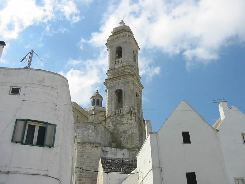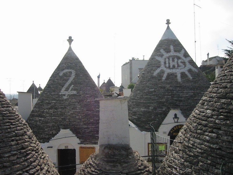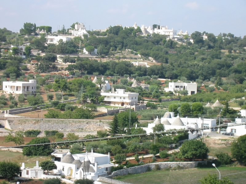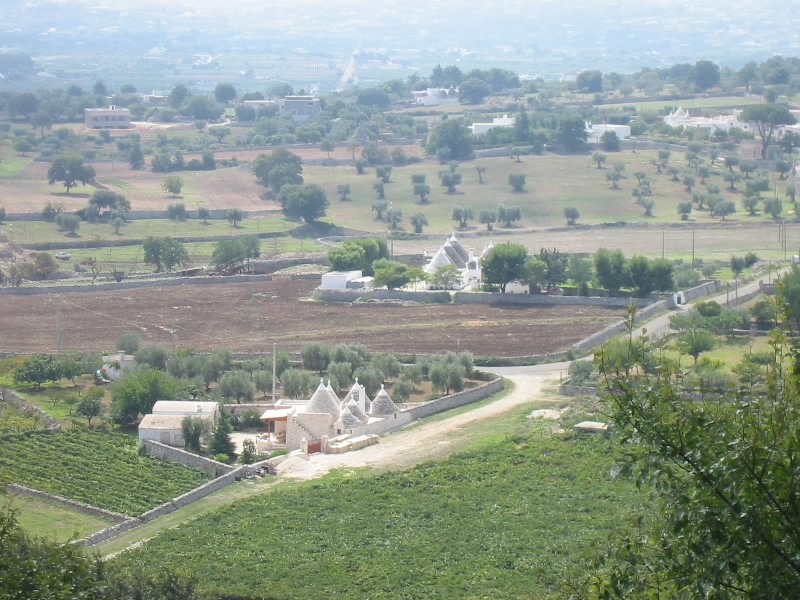 ここも静かな街だ。煤けた感じの壁が多く、歴史を感じさせる。広場や教会などを見て、一回りした感じだな。車に戻り、行きますか。街を出るところに見晴らしのいいところがあったので、車を停める。ここからの景色がまたいい。大きなオリーブの樹々の中、ところどころに見えるトゥルッリは物置にでも使っているのだろうか。遠くには白い街、ロコロトンドが見える。青い空とのコントラストが美しい。しばし景色を楽しんだあとは、ロコロトンド経由で一路アルベロベッロへ。車もだいぶ慣れてきたぞ。快調快調と思ったらロコロトンドの信号待ちでエンスト。気をつけねば。