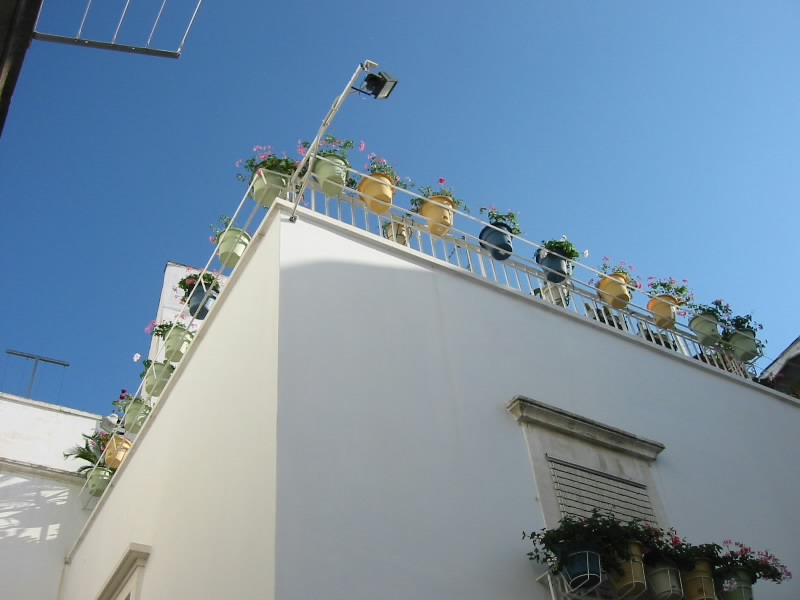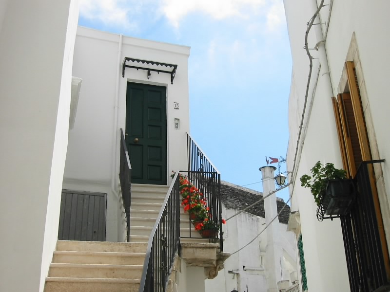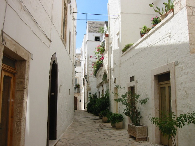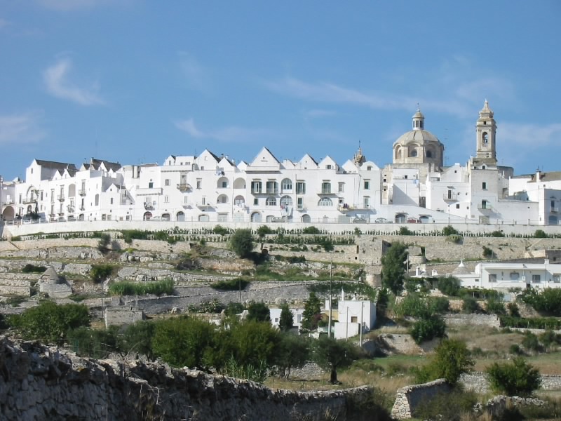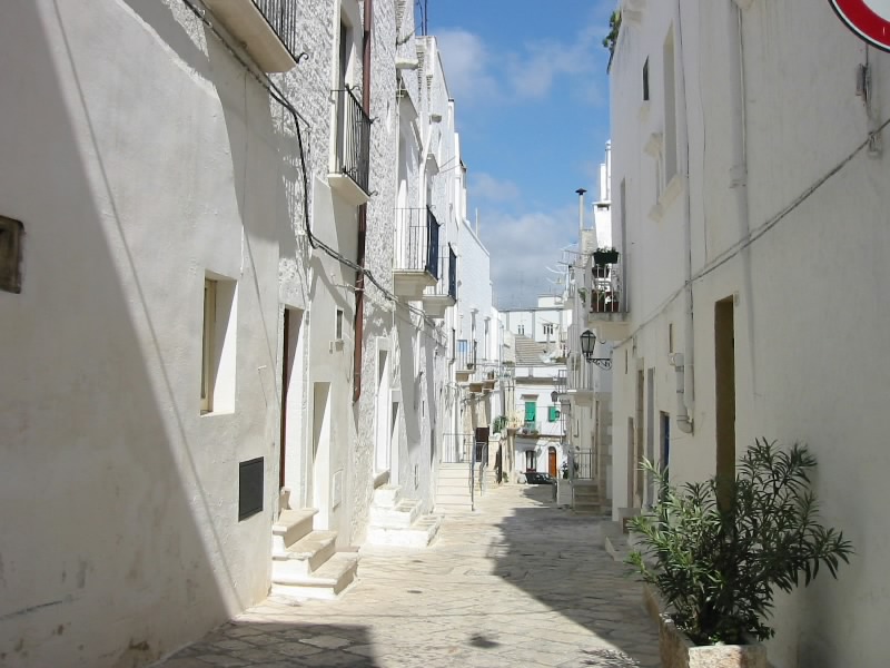 いったん部屋に戻り、でかけましょうか。途中、ホテルのフロントでさーちゃんにとってのスーパーマンに会った。我々の顔を見た途端、昨日のことを思い出したのかまたも大笑い。そして一緒にいた日本人の画家の人も大笑い。何を思ったか、その画家の人が急いでトゥルッリの中に戻り、何かをもって飛び出してきた。大騒ぎで逃げるさーちゃん。その手には、トカゲのおもちゃが。いやいや、楽しいですね。さて、今日はロコロトンドとマルティーナフランカへ行こう。今日のミュージックは、サザンのバラッド。懐かしいな。「朝方ムーンライト」とともに快調に走る。昨日ロコロトンドは通っているので、迷うことなく到着。旧市街沿いをぐるっとまわったところにある駐車場もがらがらだ。ロコロトンドはオストゥーニと同じく、高台に旧市街がある。ただ違うのは、高台からの景色。オストゥーニは「オリーブ畑とアドリア海」を楽しむ景色だったが、ここロコロトンドは「ぶどう畑とトゥルッリ」なのだ。この街が「Citta del vino bianco(白ワインの街)」といわれる所以であろう。そしてマルティーナフランカへとひろがる広大な景色には、無数のトゥルッリが点在している。静かで、爽やかで、何ともいえない不思議ないい景色だ。しばらくの間見とれる。さあて、そろそろ街に入りますか。この街も迷路のようだが地図はいらない。白い壁の間の細い道をしばらく歩いていると、お年寄りと目が合った。「ボンジョルノ」と挨拶をすると、なにやら声をかけられた。どうやらこの近くに住んでいるらしく、なんだかとても嬉しそうに話す。我々のような東洋人が珍しいこともあるのだろうが、概して人が親しみやすい。ミラノやローマなどの大都会ではあまり無い、田舎の素朴さを感じる。街をでたところにある高台にある公園に出てきた。ここからの景色も、また絶景。そして公園にいる子供からお年寄りからはたまた犬まで、すべての視線を感じながら一休み。木陰でそよそよとした風を感じ、とても気持ちがいい。