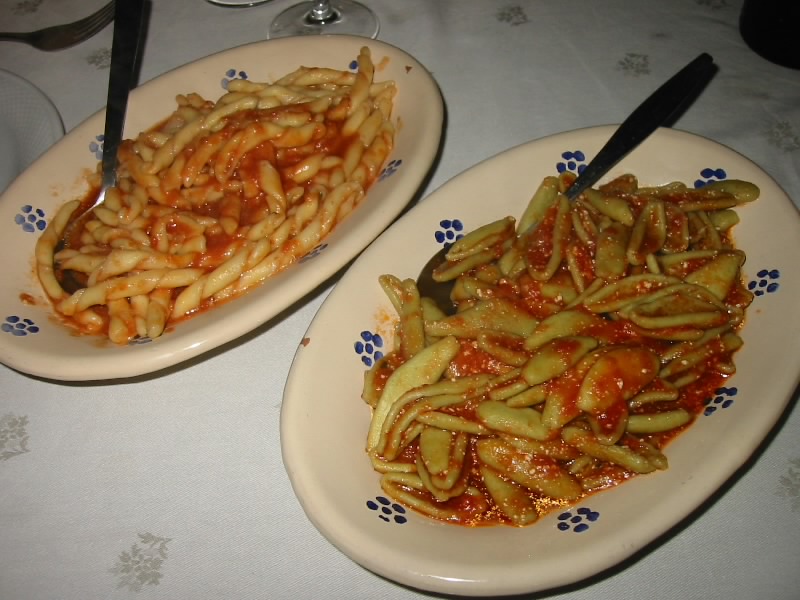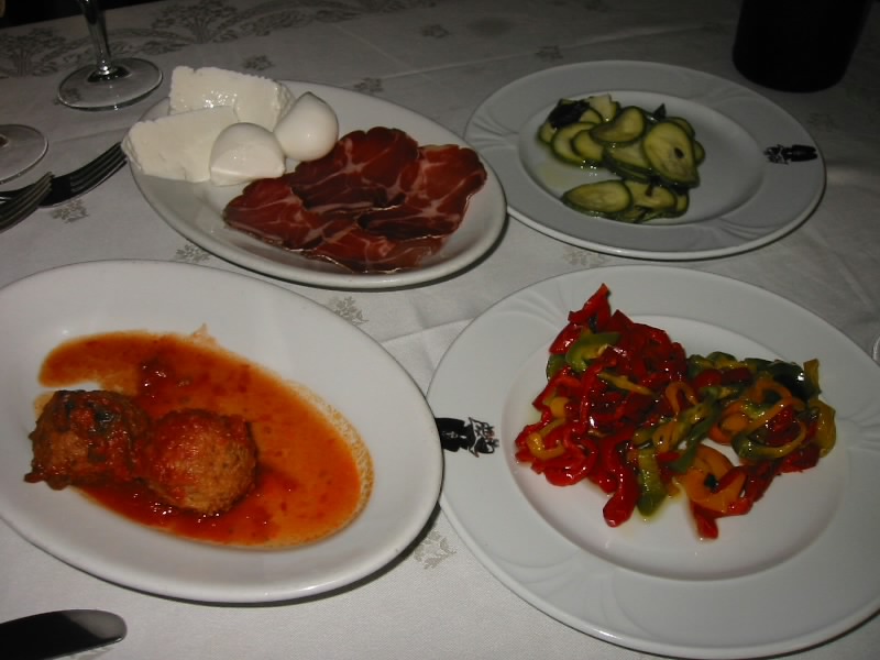 さて、そろそろ1時。さっきのレストランに向かう。ひと組先客がいるようだ。奥の席に案内され、ほっと落ち着く。さあて、何にしましょうか。とりあえずハウスワインと前菜盛り合わせは必需品。あとはパスタを2種類。シェフがお勧めのパスタから、普通のタイプとほうれん草のタイプをオーダー。まずはハウスワインで乾杯。ラベルも無いビンにはいったその白ワインは、キュッと冷えており乾いた喉に染み渡る。うまいぜ。そしてしばらくして、前菜のパレード開始。まず最初に4皿。野菜やサラミやモツァレラやミートボールなど、いろんな種類があってとても楽しい。そしれこれだけでは終わらず、野菜のグリルや野菜の肉詰め、焼いたモツァレラなど、全部で8皿。最後の皿を持ってきたとき、驚くわれわれにシェフは笑いながら「Finish!」と言っていた。テーブルの上は前菜の皿でいっぱいだ。でも基本は野菜だし、どれもおいしいしで結局すべてきれいに完食。でもこの時点で結構おなかはいっぱいだ。そしてパスタ登場。ともにトマトソースで、おいしい。ちょっと多いかな、とも思ったが、結局あっさりと完食。うまい野菜とうまいパスタはいくらでも入るようだ。困ったものだ。食後にエスプレッソと、お店オリジナルっぽいクッキーが出た。このクッキーがまたおいしいのだが、さすがに全部は食べられない。でもせっかくなので持ち帰らせてもらうことにした。ふー、ごちそうさまでした。これで29ユーロ、大満足です。