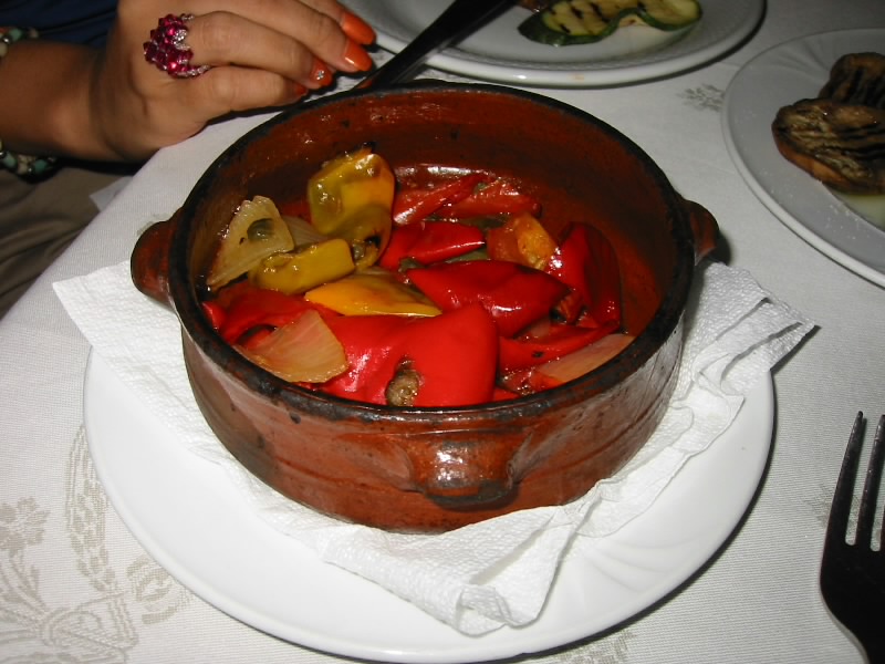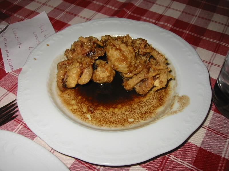 お店に入ると、朝とはうって変わって賑やかな感じ。奥の部屋はまだそれほどでもないようだが、それでも先客がいた。頼むものはもう決まっているので、メモを見せる。「わかった」という感じなのでOKだろう。まずはハウスワインで乾杯。どこのお店も、ハウスワインで十分うまいね。しばらくしてフォカッチャ登場。少しずつ食べていると、だんだんお腹がすいてきたぞ。さあ、まずはシーフードの空豆ペースト。これは・・・絶品。まず空豆ペーストそのものだが、口に含むと空豆の香りが一面にひろがり、舌触りがとてもいい。そしてアサリやムール貝、イカやエビなどの魚介と、空豆ペーストと相性が実にいい。さらに白ワインとのマッチングが最高にいい。結局、この一品がこの旅最高の一品となった。
