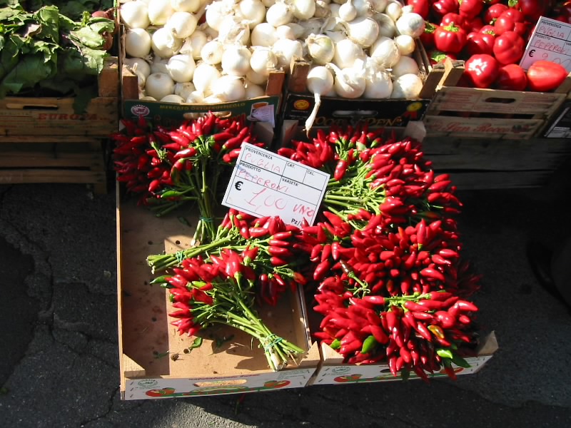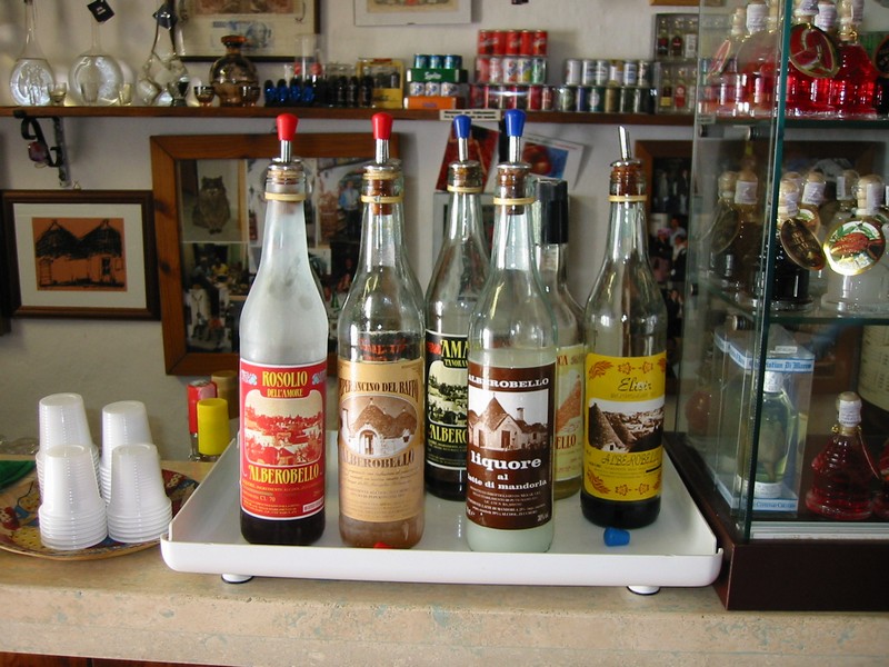 教会から少し戻ったところに、おとといナッツのリキュール買ったお店がある。ここでピッコロモンドへのお土産用に、もう一本ナッツのリキュールを買おう。ほかにもいろいろと味見をさせてもらう。なんでもここのスモールサイズのボトルは変わった形で、3本まとめるとちょうどワインボトル一本の形になるのだ。さあて、どうしようかなあ。メロンのがおいしかったし、せっかくなんで、スモールよりもミディアムサイズを買いましょう(計27E)。底が丸くてかわいいボトルだ。あとはピッコロモンドで一度飲んだ、唐辛子のリキュールがほしいな。そういえば入り口にそのビンがおいてあるお店を見た記憶があったので、メインストリートの坂道を歩く。しばらく歩くと発見。ここもリキュールがたくさんおいてある。いかにもイタリア人といったおばさんが応対してくれる。ここでもいろいろと味見をさせてもらう。唐辛子はもちろん、甘草といった変わったリキュールもある。そんななかで、桃のリキュールがなかなかいい感じ。ということで唐辛子と桃をゲット(21E)。たくさん味見をしたせいか、なんだかいい気分だ。よっぱらったんじゃないの・・・