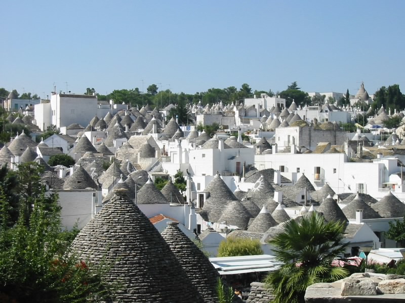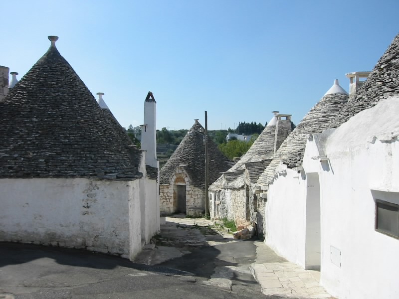 ここアルベロベッロは、大きく2つに地域に分かれる。駐車場のある通りをはさみ、泊まったホテルのある旧市街側と、教会のある新市街側。トゥルッリはどちらにもあるが、旧市街側のほうが観光客が多くて賑やかだ。市場を抜け、新市街の中でトゥルッリの集まっているアイア・ピッコラ地区へと向かう。ここは実際に人が住んでいるエリアなのだが、お店などがないためとても静かだ。トゥルッリも、どことなく古ぼけたものが多い。でもこの青い空の下、たくさんのトゥルッリが
