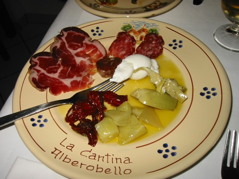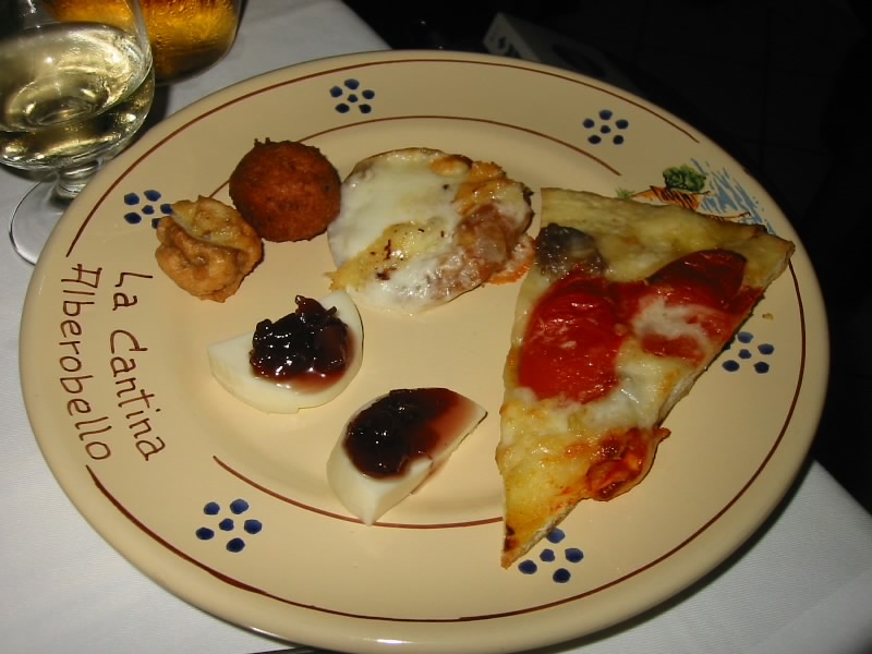 さて、昼ごはん。初日に入れなかった「La Cantina」にいきましょう。今日は無事に入ることができた。さて、何にしようかな。メニューをもらおうとするが、それよりも今日のランチの説明が始まった。耳も慣れてきたようだし、食べ物と限定された言葉なのでなんとか理解できたぞ。いつものように前菜の盛り合わせ、あとはパスタを2種類にしましょう。メインまではいらないかな。さて、まずは白ワインで乾杯。さっきサラミで赤ワインを飲んだし、なんだか飲んでばっかりだな。しばらくして前菜登場。種類の違うサラミやドライトマト、モツァレラなどだ。どれもおいしいが、食べているうちにもう一皿登場。ここにはカポナータとオリーブだ。ちょっと苦味のあるオリーブがまたおいしい。そしてさらにもう一皿登場。驚く我々に、笑いながらこれで最後だと。うーん、どこも前菜が豊富でうれしいねえ。最後の皿は揚げ物やピザなど。どれもちょっとずつで、いろいろあるのがいいね。ワインとともに完食し、満足だ。