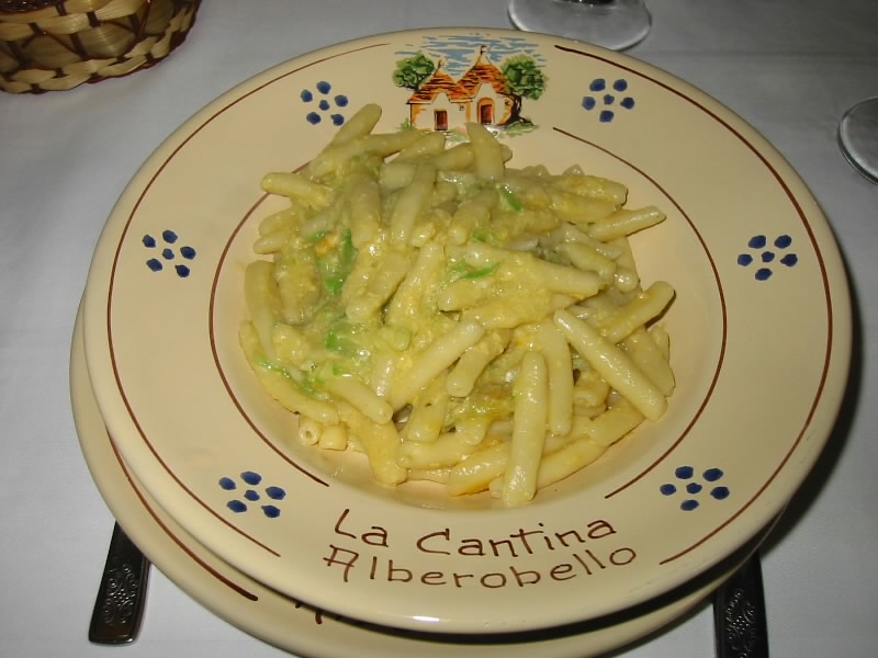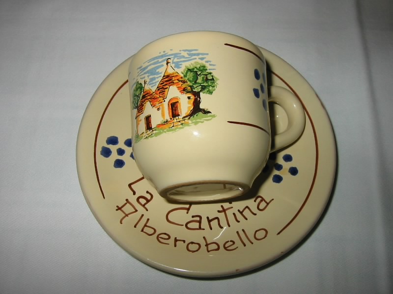 さて、続いてはパスタ。ひとつはトマトソースのオレキエッテ。今日でプーリア州を離れるので、もう食べ納めかもしれない。トマトソースの味が濃く、もちもちとした歯ごたえが当然のようにうまい。そしてもうひとつはアスパラのクリームソースパスタ。これがまたうまいうまい。コクのあるクリームソースと歯ごたえの残ったアスパラ、そしてチーズの風味がとてもいい。ワインも進むし、おなかいっぱいだ。食後にエスプレッソを頂き、ごちそうさまでした(33.60E)。なかなかかわいいカップだ。どうやらこのあたり特産の陶器らしい。