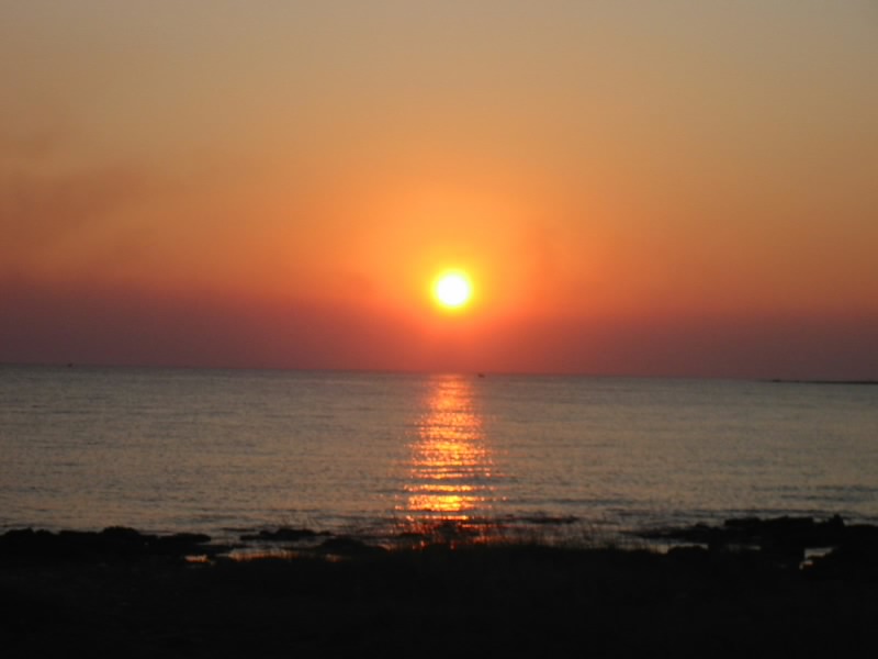 右側に行くとすぐに街を出た感じになり、民家が少しある程度。その後は道沿いにずっと砂浜が続いている。数百メートル先にはホテルが見えているのであのあたりなのかな?うーん、行ってみるか。で、行ってみたものの、どうもそういったレストランがある雰囲気ではない。わからないなあ。そろそろ日没だし、いったんホテルに戻りますか。来た道を戻る途中、太陽が水平線にゆっくりとしずんていくのがみえた。いい景色だね。それはいいのだが、レストランはどこ?ホテルに戻ると話のわかりそうなおばさんがいた。その結果、無事に海の見える部屋に入ることができた。ふう。