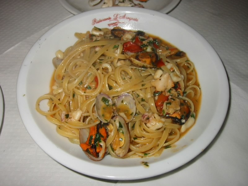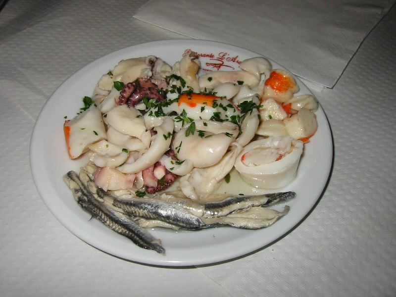 で、レストランはどこ?もう一度海まで行き、今度は左側に行ってみよう。しばらくいくと、それなりににぎやかな通りにでた。このあたりじゃないの?まだ人通りは少ないがレストランもいくつかあり、これからにぎやかになりそうな感じだ。そしてもう少し行くと、海沿いにたつレストランを発見。ここじゃないの?海沿いというより砂浜にあり、波がすぐそばまで打ち寄せて来ており、シーフードもいろいろとありそうだし、カジュアルっぽいし、聞いた内容とすべて一致するよ〜。お店の名前はEden Barだが、考えてみると、ホテルのそばにLu Canizzuっていうリストランテがあるのに、雰囲気の全く違う同じ名前の店があるなんて変だよね。絶対ここだよということで店の外観の証拠写真をとり、お店に入る。まだそれほどお客はいない。さて、どうしましょうか。まずは白のハウスワインで乾杯だ。今日は車にも乗ったしお店を求めてさまよったし、ちょっと疲れた。すっきり白ワインがのどにしみるぜ。最初は魚介のマリネ。イカやタコ、アンチョビやムール貝など、さっぱりとおいしい。いい感じだね。続いてはパスタ。もちろん魚介がたっぷりさ。海の風味が広がり、おいしいぞ。ワインも進むね。最後に魚介のフライ。イカとエビがたっぷりだ。いずれもぷりぷりとした歯応えで、レモンの酸味ととてもよくあい美味だ。いやいや、魚介づくしで満足しました(25.7E)。