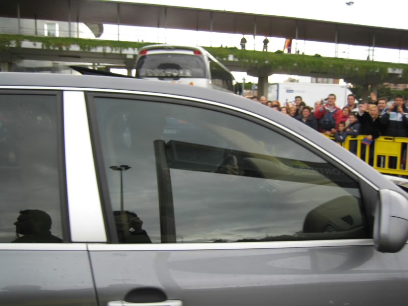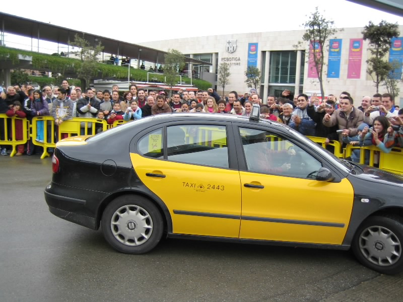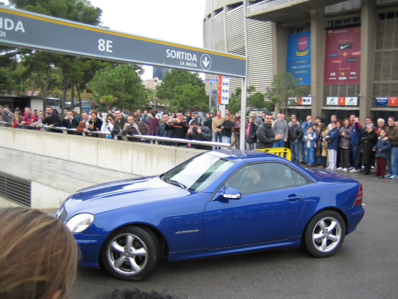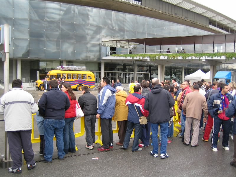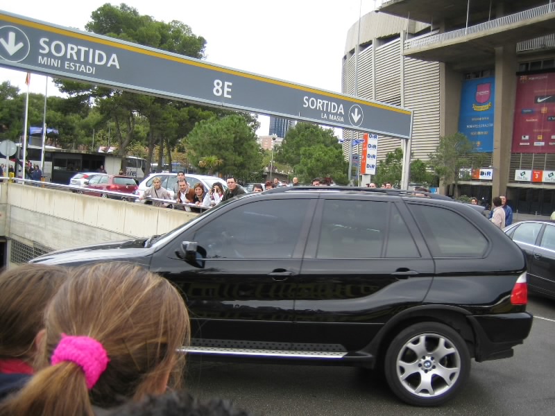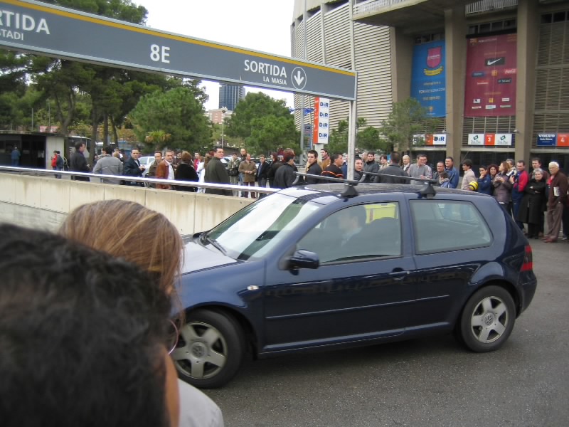 すると、妙に人が集まり始めているところがあった。オフィシャルショップやバルサミュージアムもある正面玄関で、チケットゲットの参考にしていた個人のHPによると、このあたりは「サインもらい場所」らしい。だれか来るのか?と思う間もなく、1台の車が到着。地下の駐車場に行くまでの道に集まったファンが歓声を上げる。一瞬顔が見えたが、知らない人だ。でもかっこよかったぞ。そうか、試合は夜8時からなのだが、けっこう早い時間からみんな来るのかな。せっかくなので、しばらく待つことにしましょう。わりと頻繁に車が入ってくる。歓声があがらないときは、スタジアムの関係者かな。軽い歓声があがるときは、おそらく若手の選手なのだろう。すると、なんだか高そうな車が来たぞ。歓声があがる中をよく見てみると、ロナウジーニョだ!窓が黒いので分かりずらいが、あのシルエットは間違いなくロナウジーニョ。やっぱり人気者だ。いやあ、楽しいなあ。しばらくして、シャビ登場。ここでも歓声があがった。その後、車の流れがとだえ、たまに来ても関係者ぽい感じ。11時を回ったし、そろそろチケット買いに行こうと出口へ向かうと、歓声があがった。あわてて戻ると、ライカールト監督だ。髪形が印象的なのですぐわかる。そしてまたもや大歓声。よく見ると、普通のタクシーだぞ?誰だ?と思って中を除くと、なんとエトオ。バルサを代表するストライカーは、普通のタクシーでご出勤。おもしろいなあ・・・その後しばらくすると、しだいに人垣がばらけていった。そろそろ終わりかな。あとデコとプジョルを見たかったが。ではチケットを買いに行きましょう。