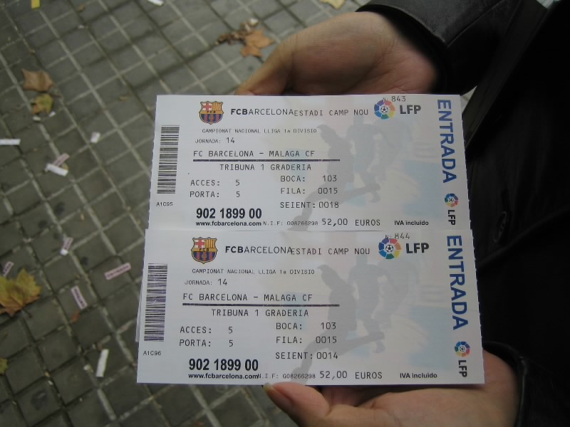 さっきは誰もいなかった当日券売り場には、もう結構人が並んでいるぞ。途中ダフ屋が声をかけてくるが、全くノーサンキュー。10分ほどで順番が回ってきた。ここまで値段がわからなかったが、狭い窓口にたどりつくと料金表がある。メインスタンドであるTribuna、2枚のDos、一階のPrimera、グラウンドに近いでCerca de Ground、Cerca de Pitch、最後にはPor Favor。変な言い方であろうが、通じてるでしょ。コンピュータから2枚のチケットが発券され、しめて104ユーロ。安くはないが、相手がバレンシアやレアルだともっと値段があがるらしい。チケットをみると、どうやら15列目なのでまあいいほうだろう。席番号がなぜか14と18で離れているが、これで実は並びかもしれないし、まあ何とかなるでしょう。とりあえず、これで一安心。