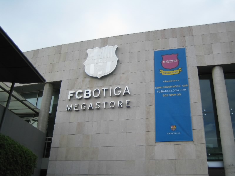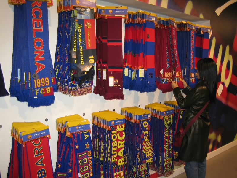さて、それではさっきのサインもらい場所に戻りますか。到着待ちの人垣はもうないが、大型の観光バスがどんどんと到着し、スタジアム一帯は人であふれている。しかしまだ12時前、試合開始まで8時間以上あるのに・・・時間があればスタジアムツアーやバルサミュージアムに行こうと思っていたが、試合のある日はとてもそんな状態ではないようだ。まあ、それらは別日に来ればいいので、今日のところはオフィシャルショップへ。ユニフォームやマフラーをはじめ、さまざまなバルサグッズが2フロアにわたって売られており、すごい賑わいだ。試合開始前になるといったいどうなるのだろう・・・いろいろとみてまわり、観戦用にマフラーを2本と、選手のサイン入り小型ボールをゲット(43.99E)。しかし、このショップだけでもしっかりと時間を過ごせる。カンプノウは、バルサ好きにはたまらない場所なんだな。ゲットしたバルサマフラーをさっそくつける。