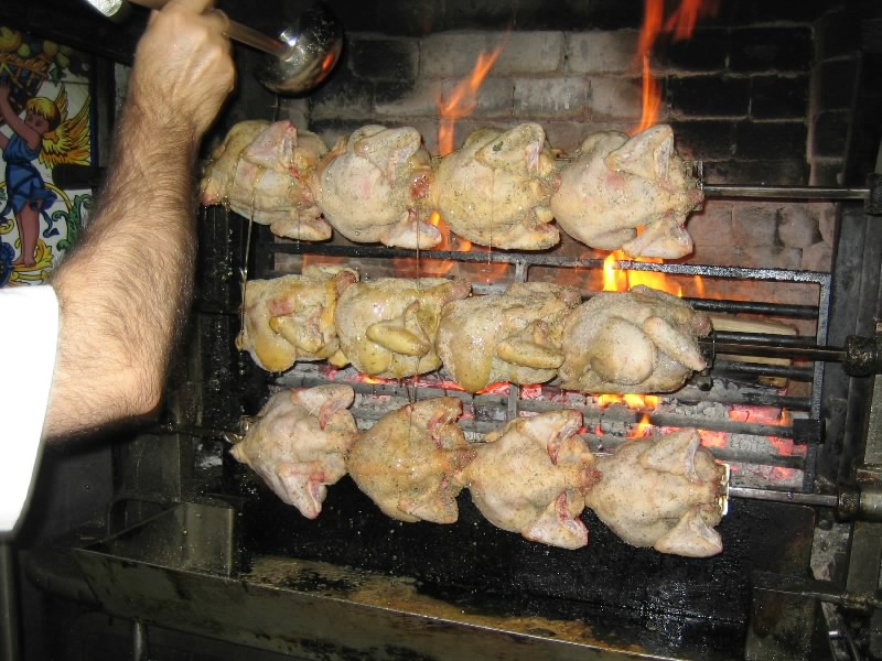 さて、まだ1時。試合開始まであまりにも時間があるので、いったんカンプノウを離れ、お昼ご飯に向かう。目指すはやはり、ロス・カラコレス。バルセロナに来たらまず行っておかないと。3番の地下鉄Drassanesで降りるとそこはランブランス通り。記憶を頼りにしばらく歩くと、見覚えのある細い通りに入り、その向こうにはロス・カラコレスが。入り口には、チキンがおいしそうに焼かれて回っているところ。ちょうどおじさんがチキンを追加しに来たところで、ガラスを開けた状態で写真を取らせてくれた。さて、中に入りましょう。入ってすぐはバルになっており、我々が首にかけたバルサマフラーをみて店員さんがうれしそうに声をかけてきた。そこを抜けると厨房があり、たくさんのパエージャが調理されている真っ最中。おいしそうだ。