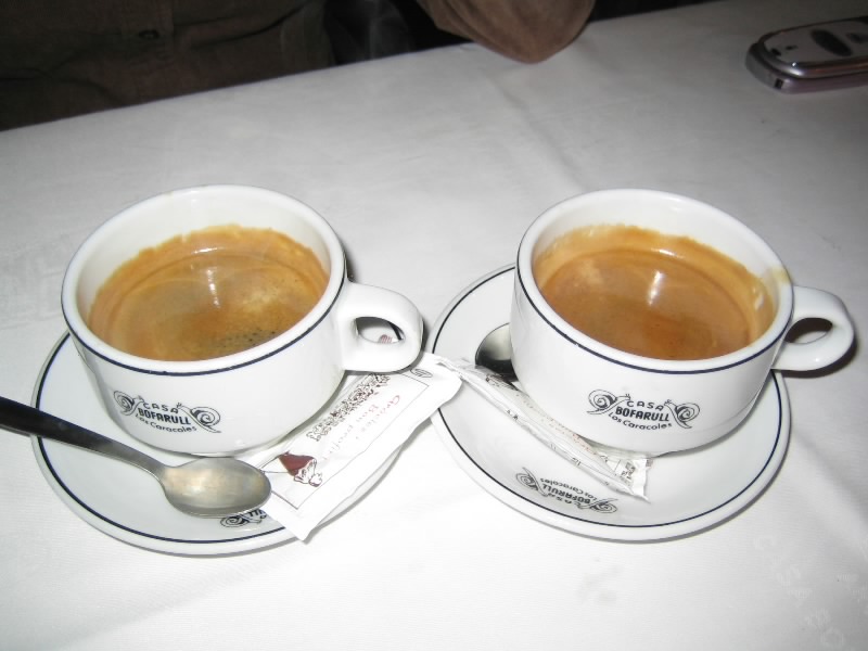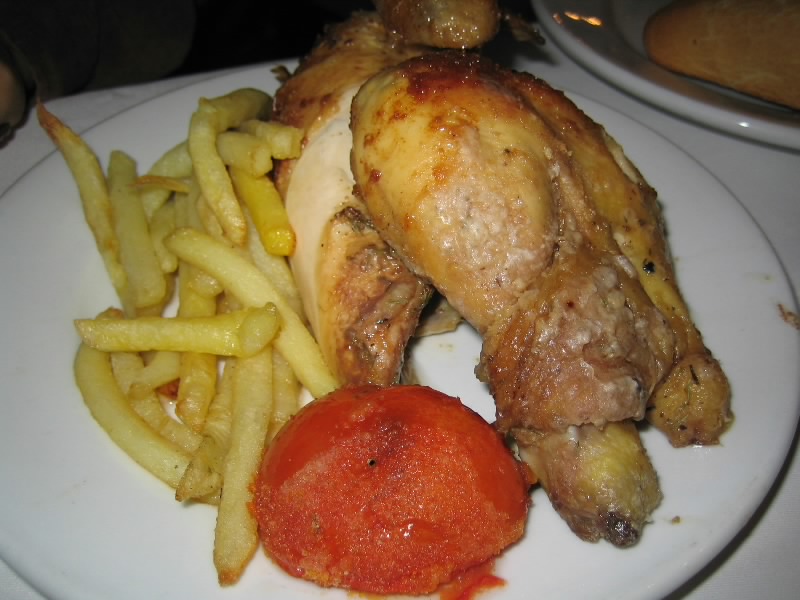 のどと胃にしみわたる感じで、おいしいな。名物のカタツムリ型のパンも出てきたのだが、これはやめておこう。しばらくして、まずはサラダ登場。レタス、トマト、ニンジン、タマネギなどにオリーブオイルとビネガーをかけて食べるのだが、さっぱりしてとてもおいしい。朝野菜が食べられなかったので、ちょうどいい。サラダを食べ終わろうとするころ、パエージャ登場。運ばれてきた途端、立ち上る海の香り・・・うまそうだ。まずは一口食べてみる・・・やっぱりうまい。エビや貝のなどのエキスがたっぷりと出ており、海の香りが濃厚に少しはごたえのある米と絡み合っている。過去に何度も食べているものではあるのだが、やっぱりうまくて感動ものだ。続いていよいよ、チキン登場。こんがりとおいしそうに焼けているぞ。少し切って、食べてみよう・・・これはうまいぞ。肉はジューシーだし、皮は香ばしくて塩味がいい感じに効いているし、全体的にハーブの風味がするし、うまいね。念願のチキンを食べられてうれしいぞ。ハーフサイズとはいえ結構な量があるので、骨を避けて少しずつ食べ、パエージャのえびのからをはずしながら少しずつ食べ、どっちもおいしいので幸せだ。ふう、完食。食後にコーヒーをゆっくり楽しみ、大満足です(55E)