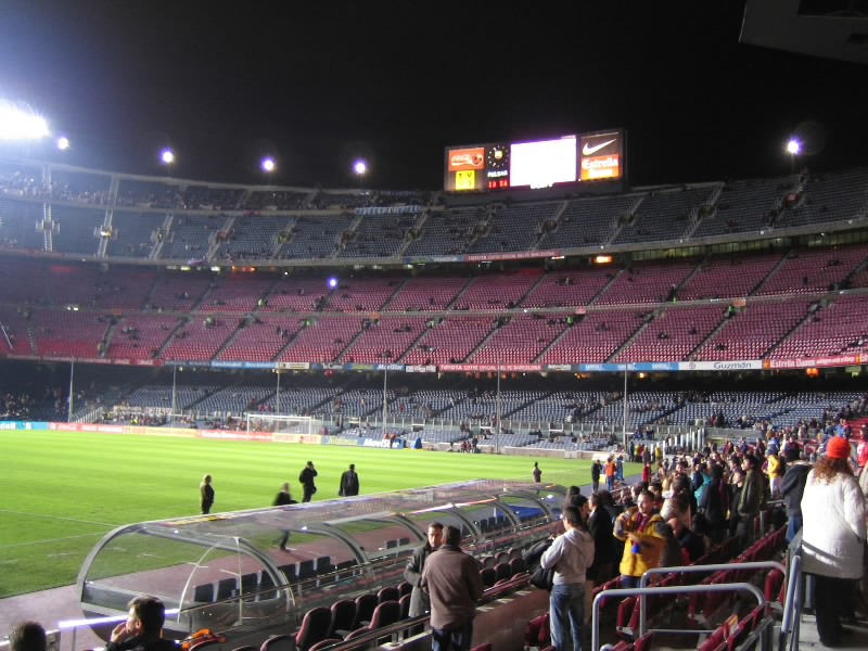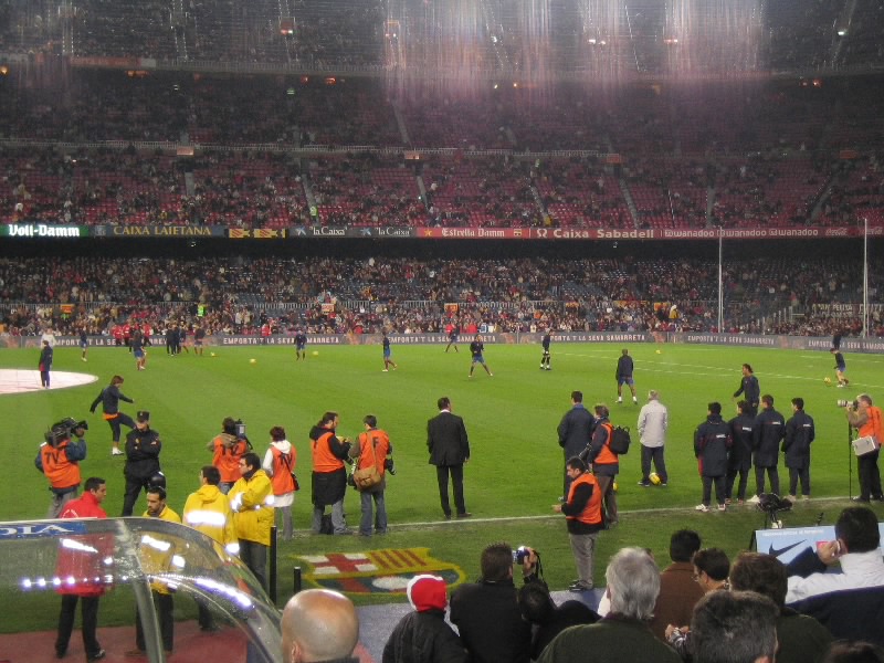 これは近いぞ。トラックも無ければ柵もガラスも無いので、ユーべのデッレアルピはもちろん、パルマのエンリコタルディーニと比べてもずいぶんと近く感じる。10万人入るスタジアムにも関わらず、だ。席は前から15列めで、結構近いのに全体が見渡せ、いい感じだ。まだ開始まで1時間以上あり、席もがらんとしているので、とにかく前まで行ってみましょう。一番前はVIP席で入れないので、その手前まで行ってみる。ほんとに近いぞ。ピッチサイドでは、カメラマンたちが準備中。ちょうど目の前にカメラマンがいたのだが、なにやらこちらに手を振っているぞ。と、カメラがまっすぐこっちを捕らえていた。バルサのマフラーを振りながら笑顔で応えておこう。今ごろ倉敷さんあたりが、「ああ、日本の方ですね。いやあ、こうしてヨーロッパにまでサッカーを見にくる日本人が増えてきていますねえ。すばらしいことですね。」とでも実況されているだろうか。