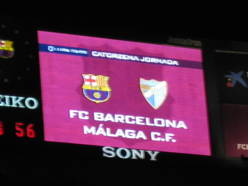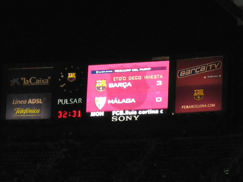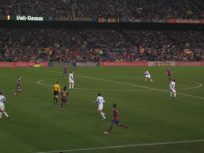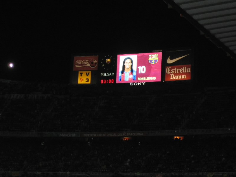 席に戻ると、いつの間にやらほぼ満席になっている。席につき、しばらくすると 場内にバルサの応援歌が流れ始めた。これにあわせて、選手たちが再度入場。 子供たちとの写真撮影等をすませ、スタメン発表。いつもこのスタメン発表で映る 選手たちの顔を一人ずつ写真にとるのだが、なんだかやたらとシンプルで早い 紹介で、写真が全く追いつかなかった。でもたまたまだが、ロナウジーニョの 画面が撮れたのでいいか。とおもっていたら、いきなりキックオフ。なんだ、やりだしたら早いねえ〜。とにかく試合が始まった。