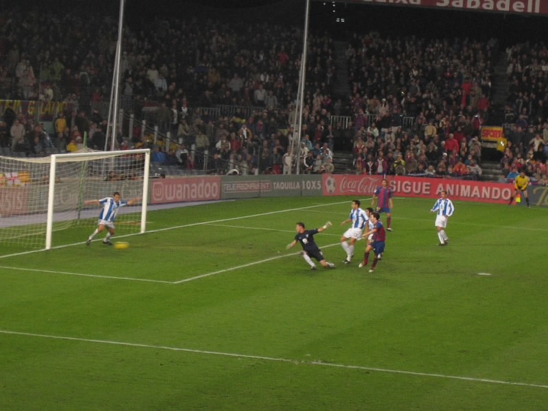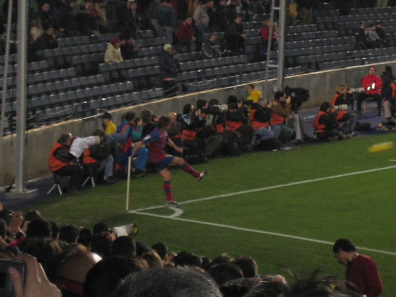 前半は右手がわへの攻撃なので、少し距離はある。でも非常に見やすい席だ。開始早々から、試合を支配しているのはバルサ。圧倒的なボール支配率ののち、前半24分、マルケスが奪ったボールをデコからうけたエトオがドリブル突破して。バルサ先制だ。エトオがゴール前でボールを受けたときの歓声と、ゴールが決まった瞬間スタジアムに響き渡る歓声。その盛り上がり方がすばらしい。拍手に包まれるスタジアムが、しばらくの間の静けさのあとまた盛り上がりを見せ始める。前半28分、エトオからボールを受けたデコがミドルシュート。ボールはゴール左隅に突き刺さる快心のゴールだ。スタジアムは一挙に盛り上がり、デココールが響き渡る。いいねえ、楽しいねえ。さらにバルサの攻勢は続く。結局前半はこの2点どまりだったが、エトオの惜しいシュートがあったりして盛り上がる。いやいや、面白い前半戦でした。ただ・・・目の前のねえちゃんのたばこと斜め前のおっちゃんの葉巻、なんとかしてくれえ。北欧やアイルランドとは全く異なり、まさにこんな人ごみでも吸い放題なのだ。禁煙なんて概念がないのかと思えるほど、そこら中で吸いまくり。動けない状態で吸われつづけるのはかなりつらいが・・・