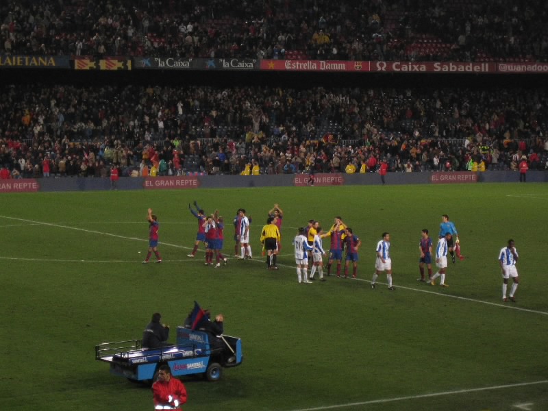 そんなことには負けてられない。後半戦がスタートだ。今度は左側への攻撃なので、バルサが近くにみえるはず。前半同様、どんどんと攻めてほしいものだ。バルサの攻勢は相変わらず続く。そして後半26分、マルケスのスルーパスに反応したデコがキーパーと1対1に。デコは決めそこなったが、つめていたイニエスタがシュート。ボールは飛び出したキーパーの足元を抜け、ゴール左隅に決まった。バルサ3点目、イニエスタは初先発の初ゴールらしい。若手もがんばっているね。いいぞいいぞ、おもしろいぞ。そしてバルサショーのとどめはまたもエトオ。後半ロスタイム、イニエスタがドリブル突破し、エトオにパス。これをうまく受けたエトオが、キーパーをよく見て右隅にゴール。4点目だ。そしてタイムアップ。最高の締めくくりだ。観客はスタンディングオベーションで選手を迎える。あとからわかったことだが、今日の観衆は61,000。確かに3階席にはかなり空席が目立つ。これで6万なんて、長居でも入りきらないし万博なら2つ分だ。すごいもんだ。
