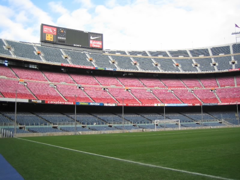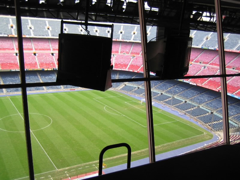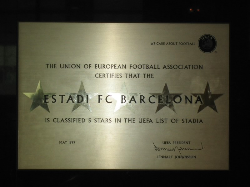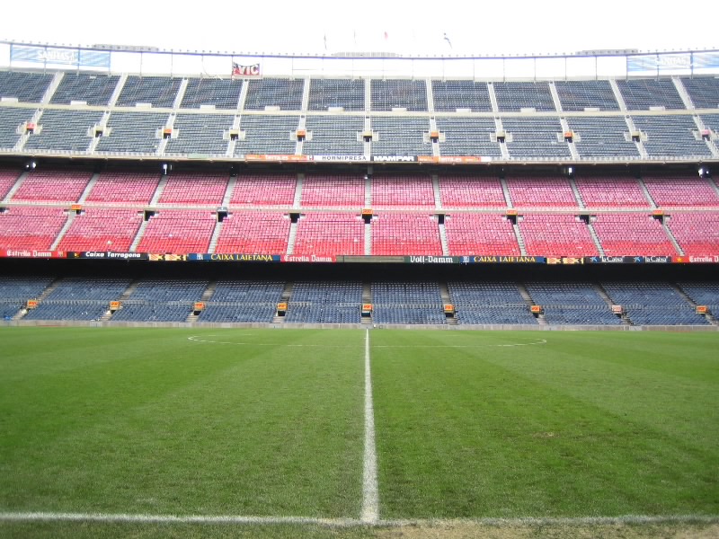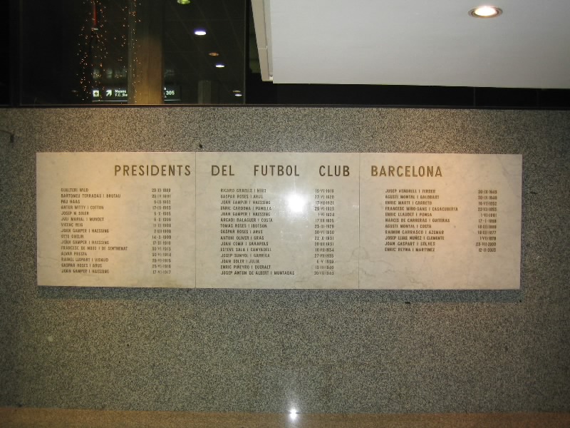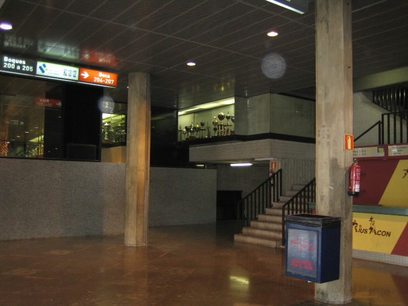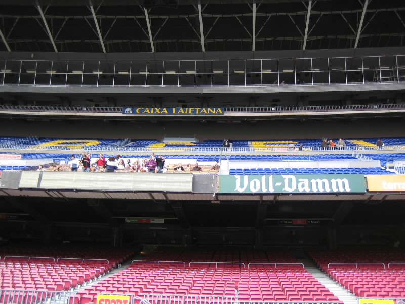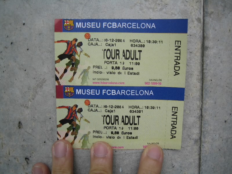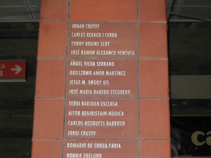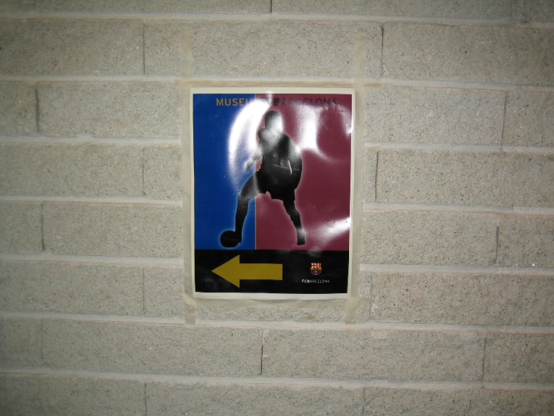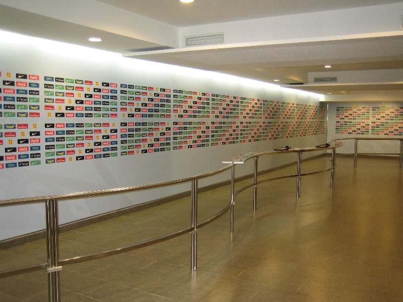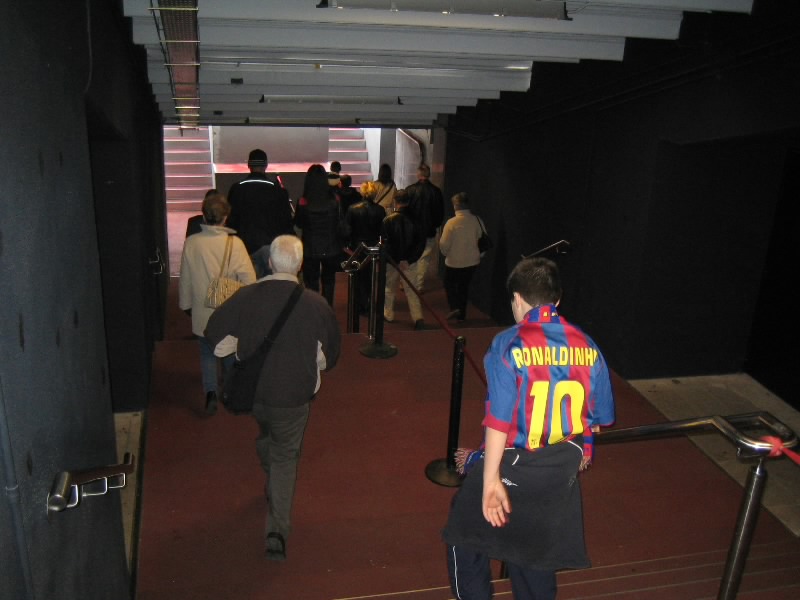 部屋に戻り、準備をして出発だ。ホテルからランブランス通りへと向かう。昨日あれほどいた人が、この時間はほとんどいないので歩きやすい。ランブランス通りにあるLiceu駅から回数券9回目、あと一回。ちょうどだな。3度目のマリア・クリスティーナ駅到着、そして10時半ごろ、3度目のカンプノウ到着。もはや勝手はわかっているので、迷うことはなくスタジアムツアーのチケット売り場へ。10人程度が先に並んでいる状態で、すぐに順番が来た。事前の情報ではツアーは1時間に一回程度だとか、スペイン語と英語を交互に使って説明するとか聞いていたので、窓口でいきなり「English?」といわれたときはとっさに「チケット購入のやり取りを英語でするか?」の意味と思い、「Yes!」と返事。それで11時からのツアーを無事にゲット(19E)。ツアーのスタートであるゲートに行くと、人が既に集まっており、そろそろ始まる感じ。そしてほどなく受付が始まったので入ろうとすると、「今は10時50分の回だ、もうちょっとまって」みたいなことを言われた。そんなに頻繁にやるようになったのか?10分程度なので、そう待つことなくツアーの受付開始。まずはがらんとしたホールのようなところに通される。全部で20人ほどかな。日本人の女の子もいるぞ。ここでしばらく待っていると、小柄なおねえさん登場。ヌリアというこの女性が説明をしてくれるのだが、そういえばずっと英語。ということはさっきの「English?」は「英語の回でいい?」って意味だったのね。そうか、おそらく参加人数が多くなったので回を増やして言葉を分けたのかな。
