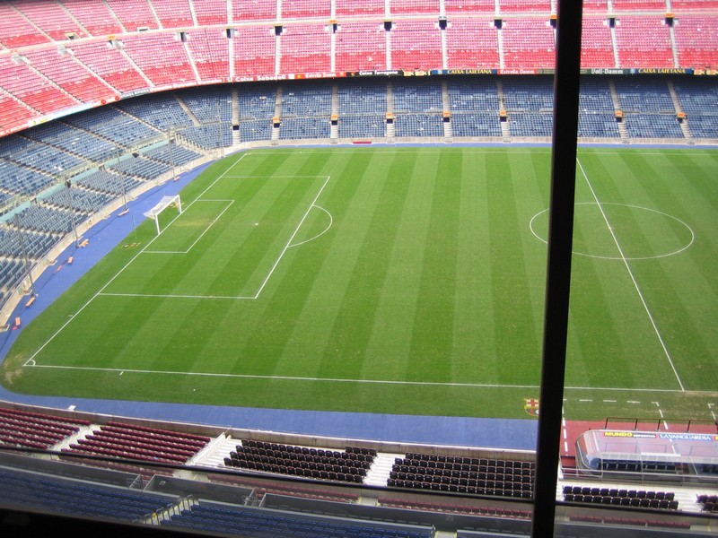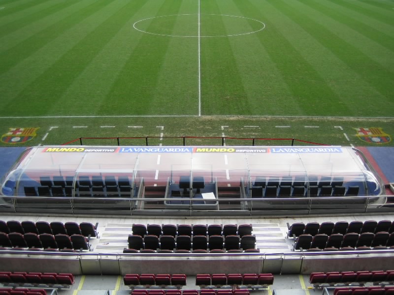 階段を降りきって少し歩くと、最後に少し上り階段がある。いよいよピッチだ。光が差し込む狭い階段を上ると、そこには広大なピッチが静かに広がっていた。選手と同じ目線でピッチに立ったのは初めてだが、さすがに広い。そして周りには10万人収容の座席がある。ぐるっと取り囲まれているようで、これはすごい迫力だろう。アウェイチームにとっては大きなプレッシャーとなるだろうな。控え選手や監督が座る席は相手チームとそんなに離れていないところに位置するので、お互いの動きや作戦が見えてしまわないのだろうか。まあ大歓声でそれどころではないのかな。ピッチの中までは入れないのでベンチ前にいるだけなのだが、それだけでも十分楽しめる。でもちょっとだけ、ロープを超えて芝を触っておこう。