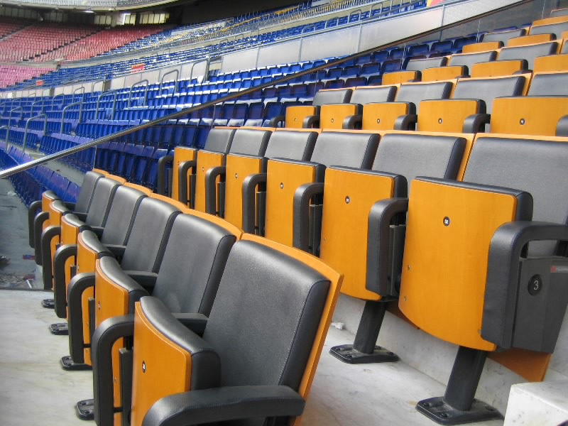さて、どんどん行こう。階段を登ると、突然大理石の床が。赤いソファーがあったり、バーカウンターがあったり、どうみてもVIP室。試合前のひと時を、VIPたちはここで葉巻をくゆらせ、ブランデーの香りを楽しみながらゆったりと過ごすことだろう。ここからはVIP専用席に出られる。一般の席とは異なり、クッションの効いたいい椅子だ。屋根もちゃんとあるし、ベンチの様子も上から分かるし、さすがにVIP席と言ったところ。ここはどんな人が座るんだろうなあ。何枚も写真を撮っておこう。こんなことでもないと入れないしね。