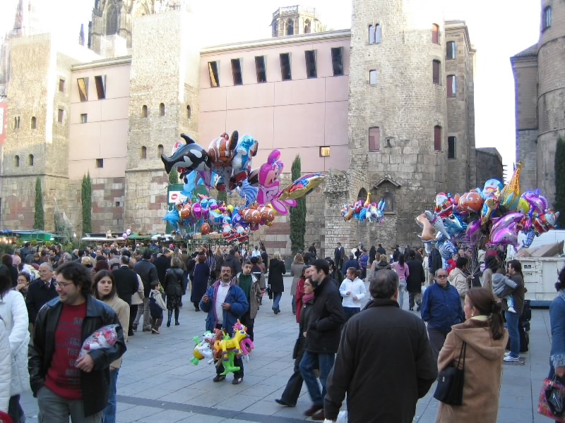 Liceu駅を上がるとランブランス通り。朝とは全く異なり、かなりの人でにぎわっている。通り沿いにたくさんの花屋さんが出ているのだが、時節柄ポインセチアが目に付く。赤い花に金粉をまぶしたものもあり、なかなかキレイ。ランブランス通りからカテドラルへ向かう細い道は、さらに凄い人。みんな何をしにきているんだろうか。人の波をくぐりぬけ、カテドラル前の広場に到着。ここはやっぱり今日もにぎわっている。いろんな風船や、クリスマスの屋台がたくさん出ている。ふう、疲れた。部屋に戻り、しばらく休憩しましょう。