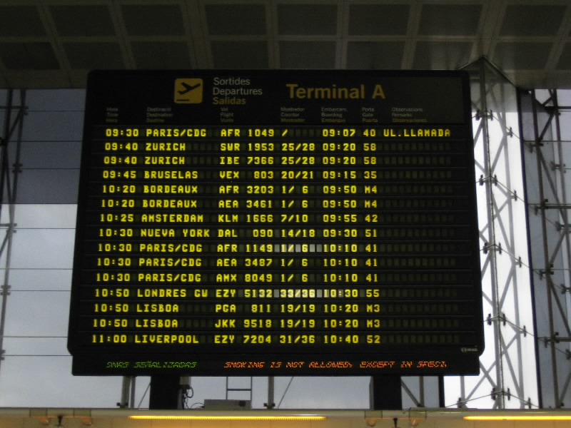 バスは国際線ターミナル前で停まった。早速チェックイン。関空までチェックインできるのだが、パリからの予約が事前では窓際が取れていないので変更してもらおうとしたが・・・残念。やっぱりあいていないらしい。まあ仕方ないか。セキュリティを通り、出発ゲートへ。まだ1時間以上あるので、それほど人はいない。近くにお店がいろいろとあるので、そこでおみやげのチョコレートやマロングラッセなど、最後のお買い物(24.60E)。出発ゲートに向かうと、人が集まり始めたようだ。いかにもサッカー好きそうな、バルサショップの袋をもった3人組もいる。みんな思い思いの休日を過ごしたんだろうな。