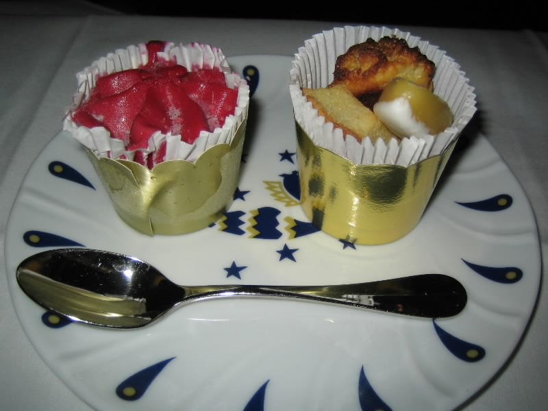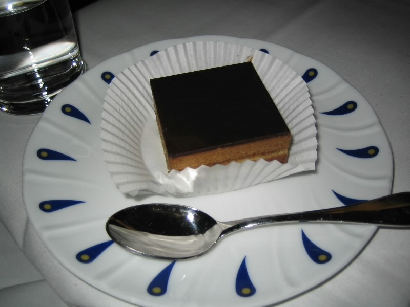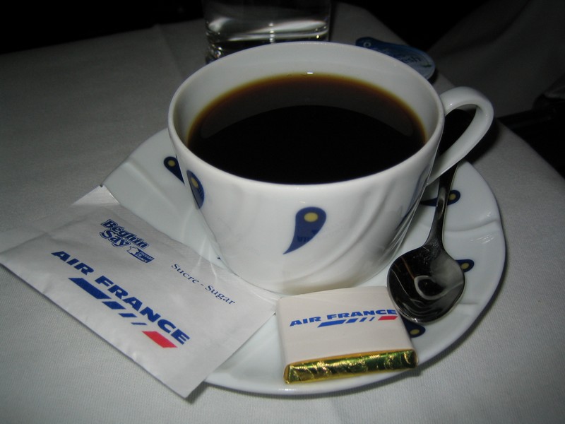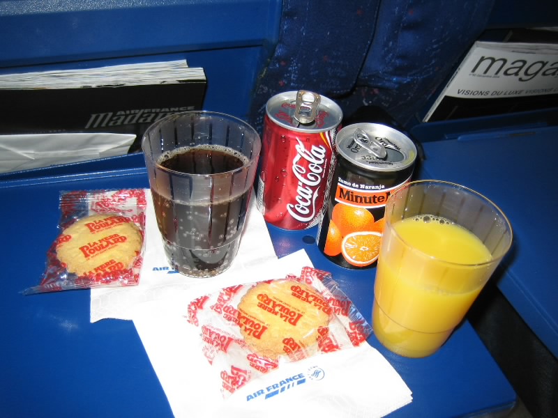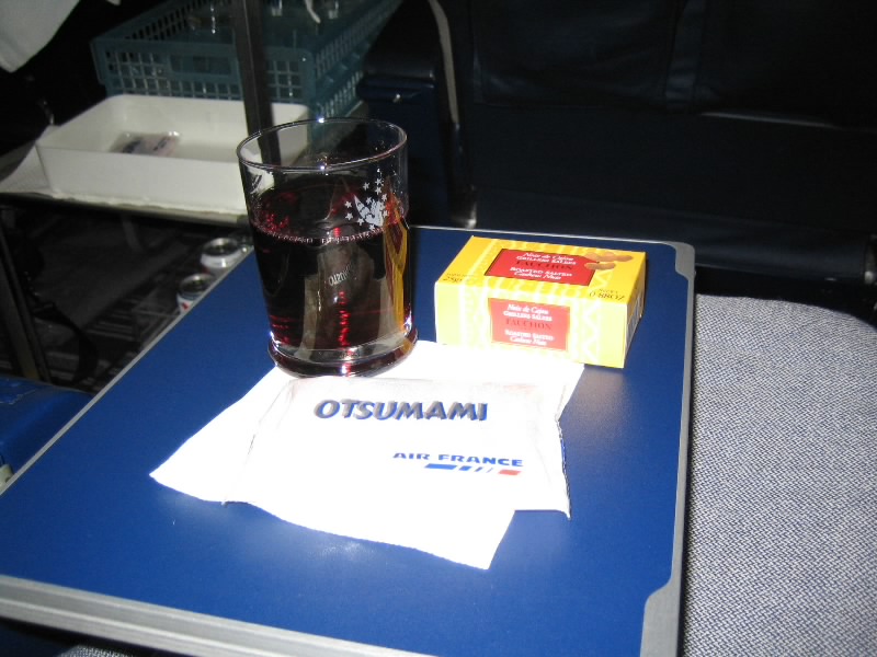 メインのあとは食後のチーズタイム。さすがエールフランスだね。3種類あり、カマンベールとシェーブルとウォッシュ。ワインとともにいい感じなのだが、食後にこの量は無理。食べ慣れてないので、こんなには食べられないっす・・・そしてデザート。オペラケーキはチョコレートの苦味と甘みがバランスよくておいしい。カシスシャーベットは少しねっとりとした舌触りで、これがなかなか癖になるおいしさ。クッキーもついてくるのだが、しっとりとした感じでおいしい。さすがお菓子の国、フランスだねえ。デザートは少しでいいのだが、これはしっかりおいしくいただきました。
