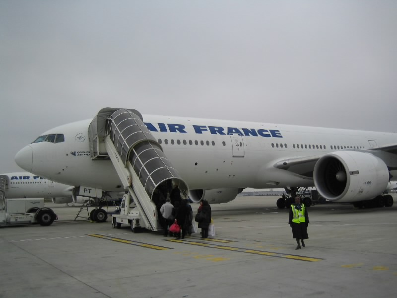 ここから大阪行きに乗り継ぐのだが、結構歩くし途中に出国やセキュリティのゲートもあるしで、思いのほか時間がかかった。チェックイン済みだし荷物も預けているし、置いていかれる心配はないのだが、大阪行きのゲートについた頃には、既に搭乗が始まっているところ。今回はアップグレードでのビジネスクラスなのでビジネスラウンジにもいきたかったのだが、それはとても無理。急いでゲートを通り、バスに乗り込む。パリはやっぱり寒いな。バスは空港内を走り、しばらくするとエールフランスが集まっているところに到着。せっかくなので写真を撮ると係員に注意された。最近よく注意されるが、まあ撮ってしまったしいいか。飛行機に乗りましょう。