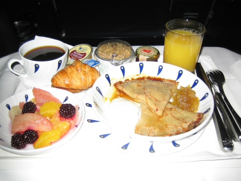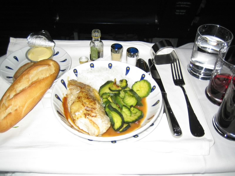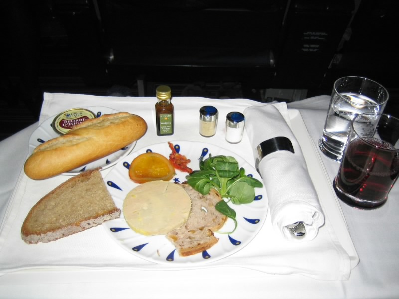 離陸し、しばらくしてドリンクサービス。配られるおつまみが、FAUCHONのカシューナッツ。さすがだね。ワインとともにおいしく頂く。そして機内食タイムが始まった。まずは前菜。フォアグラとシーフードの選択で、ここはフォアグラにしましょうか。まず白いナプキンが敷かれ、陶器のお皿が運ばれた。そこには大きなフォアグラを中心に、くるみのパンとオレンジの砂糖漬けと野菜。サーブされるパンもおいしそうなフランスパンだ。いただきましょう・・・うまいぞ。濃厚だがすっとひく感じでしつこくない。ブルゴーニュの赤ワインとともにおいしくいただく。続いてはメイン。牛フィレ肉と舌平目、そして本日のおすすめからの選択で、本日のおすすめがホロホロ鳥のケッパーソース。これにしましょう。温かいお皿においしそうな鳥肉、付け合せにズッキーニとライス。見るからにおいしそうで、これはボルドーの赤といただきましょう。