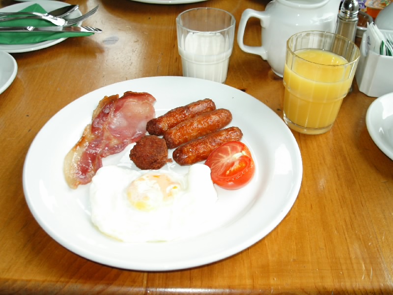 しばらくして、アイリッシュブレックファスト登場。あつあつのソーセージやベーコン、トマトと卵。想像通りの内容だ。そしてこんがり焼けたトーストもでてきたぞ。まずはソーセージ。皮がぱりっとして、中がジューシー。うま味が口の中に広がり、そこで焼きたてのトースト。うーん、旨いではないか。ベーコンもしっかりとした歯応えだし、卵もいい感じに半熟だし、トマトの酸味もさっぱりしているし、どれもとっても旨いです。ゆったりとした朝ごはんを堪能。最近イタリアやフランスなど、シンプルな朝ごはんが続いていたので、ヨーロッパでは本当に久しぶりの、食べごたえのある朝ごはんでした。ごちそうさまでした。