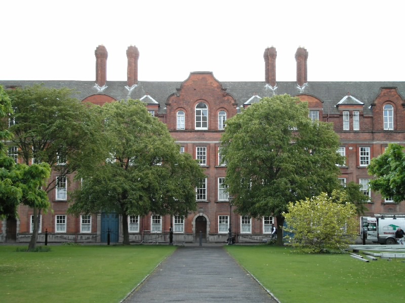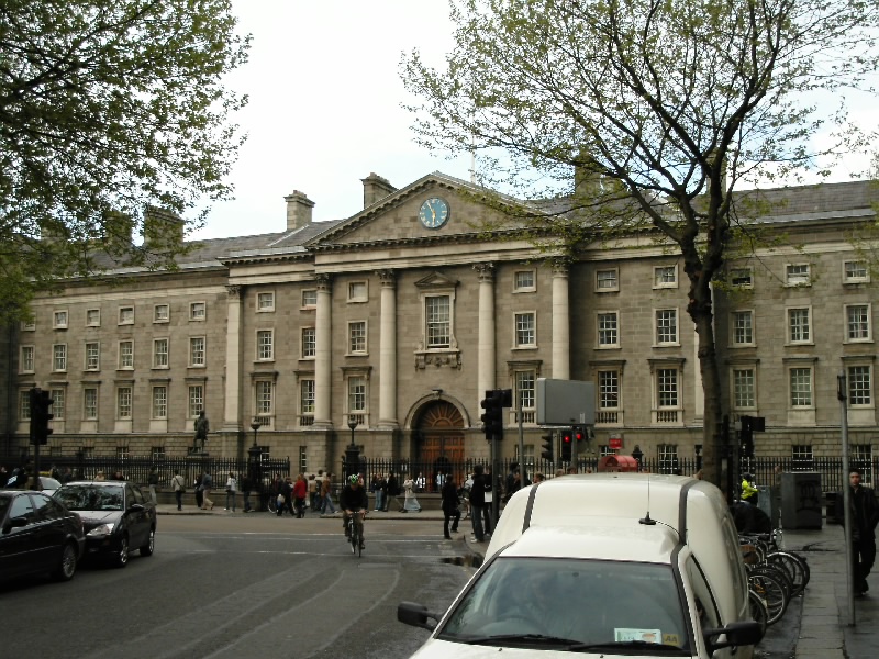 部屋に戻って準備をし、ダブリン観光に出発だ。天気もいいしね。まずはすぐ近くにあるトリニティカレッジへ向かう。途中、アイルランドのイメージ通り、レンガ作りの建物がある。数分で正門に到着。ここは1592年にエリザベス1世によって創設された、由緒ある大学。校内にはたくさんの学生らしき人たちがいるが、ほかにも子ども連れの家族やお年寄りもいる。市民にとってはちょっとした憩いの場にもなっているようだ。ざっと校内を散策する。