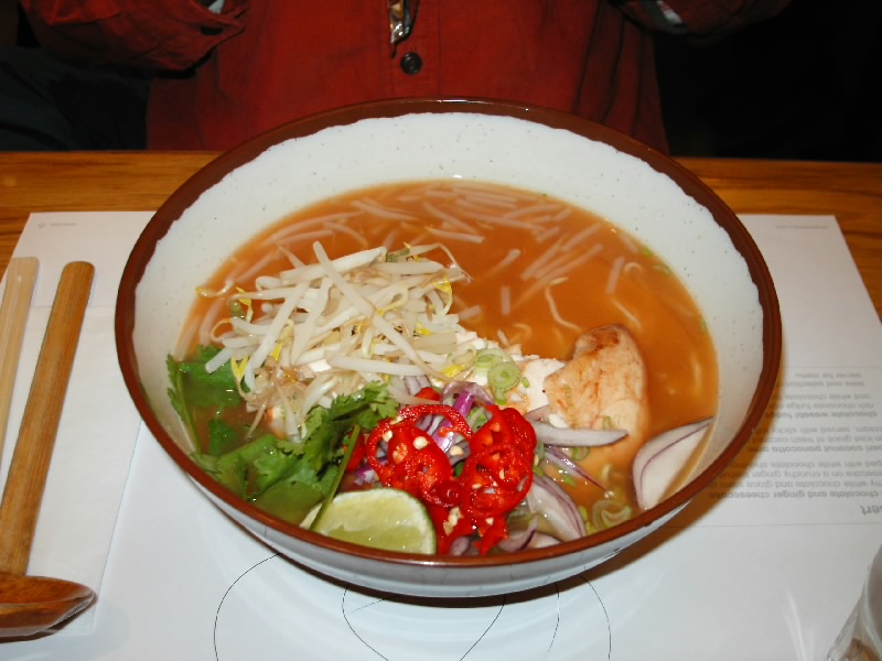 しばらくデパートにいたがやみそうにないし、そろそろお昼ご飯の時間。朝しっかり食べたし、夜もしっかり食べたいので昼は軽めにしましょう。というわけで、デパートに隣接のヌードルレストラン、WAGAMAMAへ。店内はけっこう賑わっている。さあて、何にしようか。期待はできないがラーメンで、というわけでWAGAMAMAラーメンとチキンチリラーメンをオーダー。水は日本と同じくサービスのようだ。しばらくしてでてきたものは・・・不思議な一品。WAGAMAMAラーメンは、ラーメンなのに厚揚げやかにかまが入っている。スープや麺は大昔にデパートの食堂や学食で食べたような、そんな感じ。期待はしていないとはいえ、最近の日本のレベルの高さを思い知らされる。チキンチリラーメンは、インスタントのトムヤンクンの中に麺が入っている感じ。いずれにしても、期待してない通りの味かなあ。まあ、ダブリンではやむ終えないかな。(22.90E)